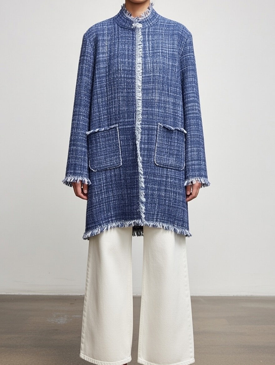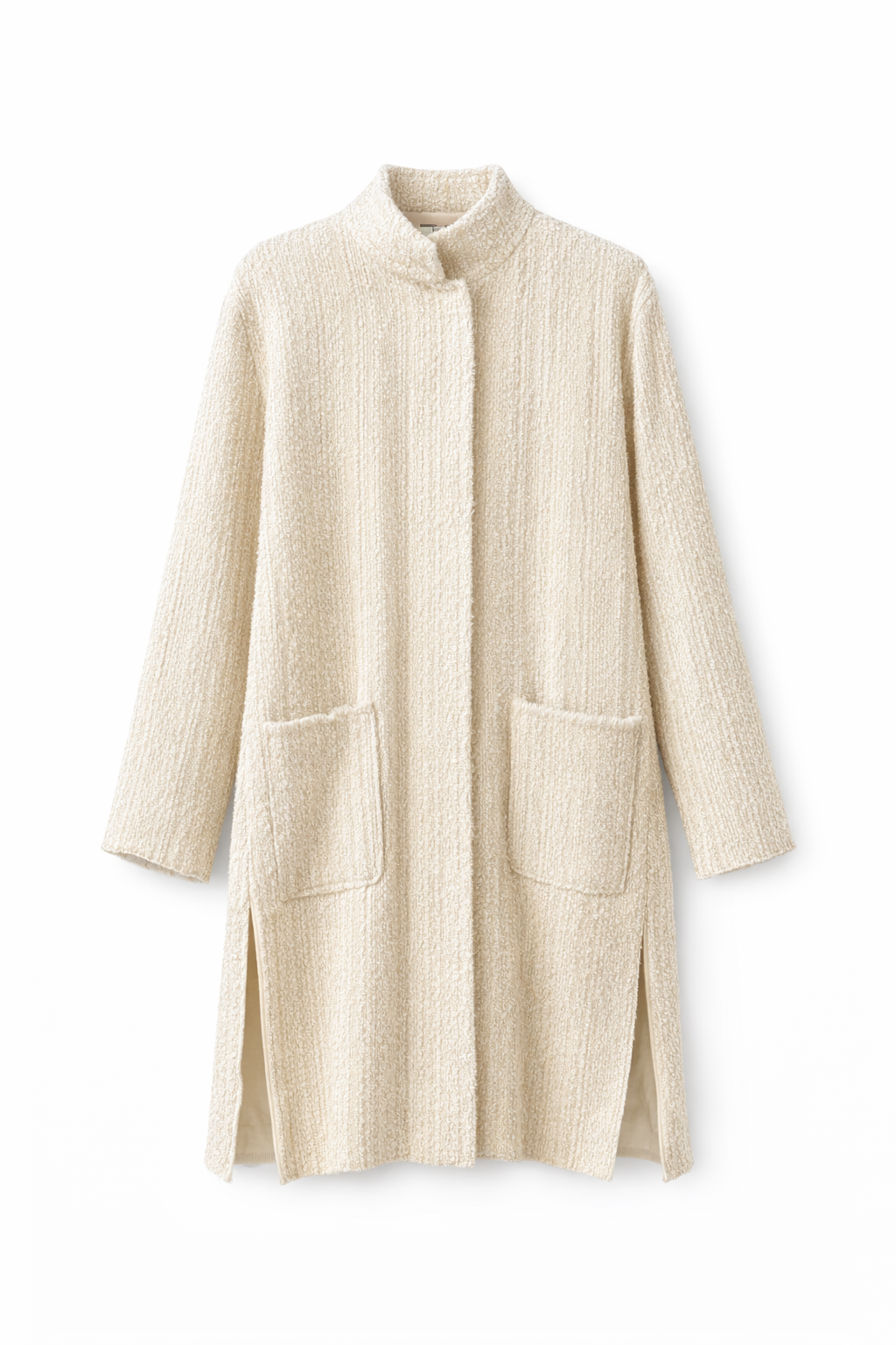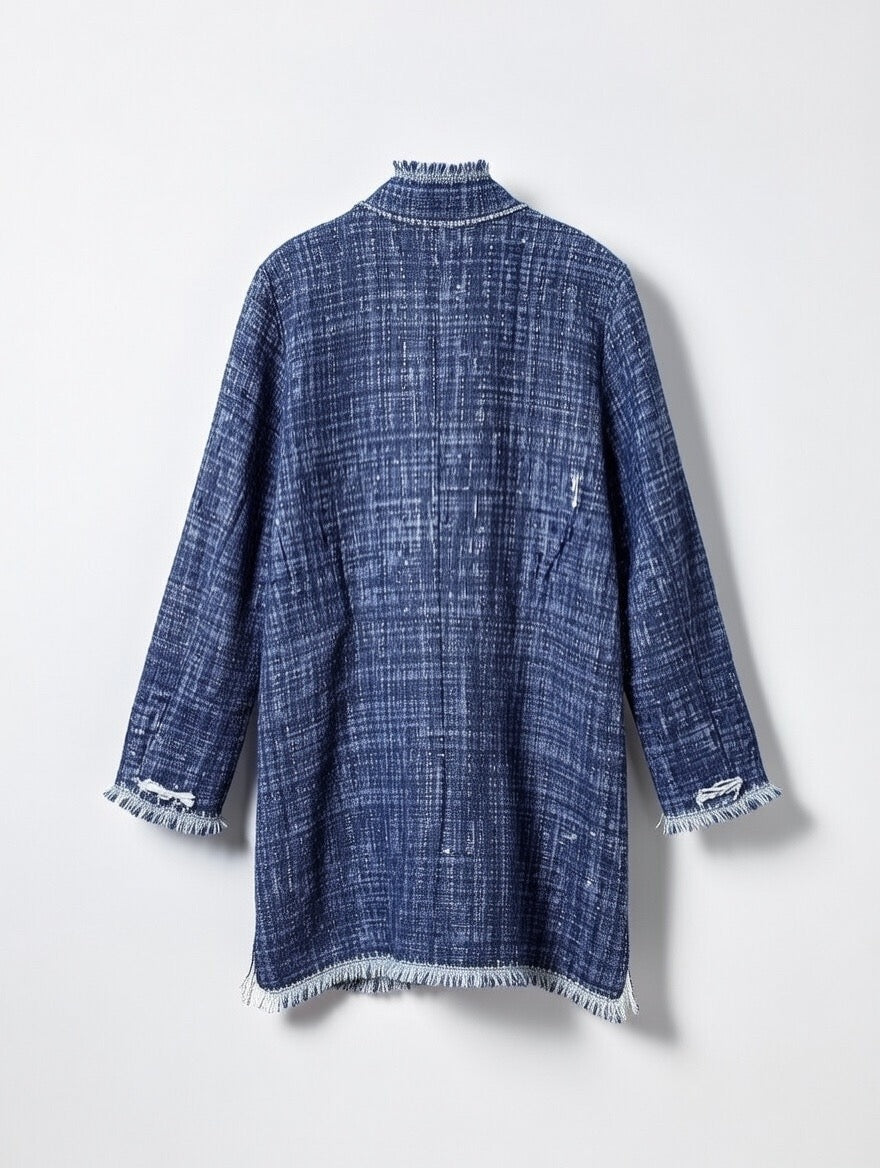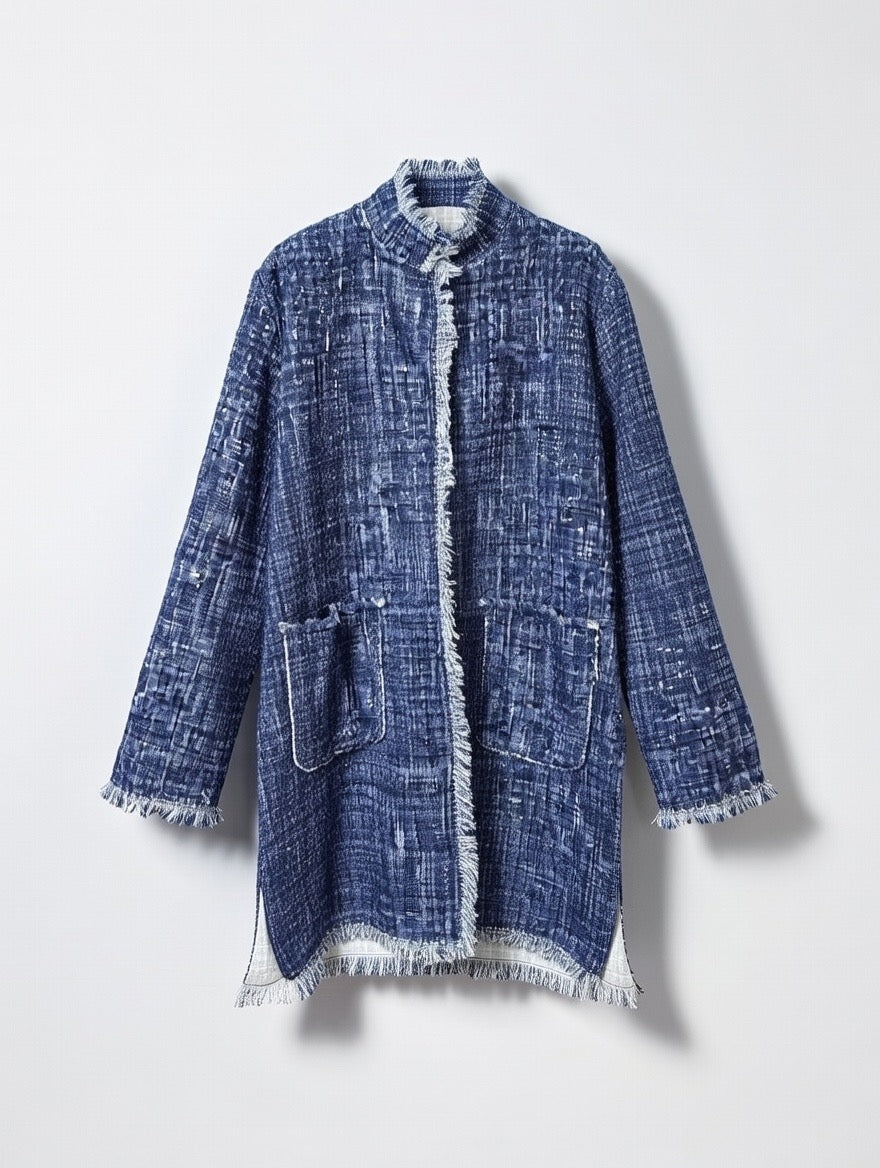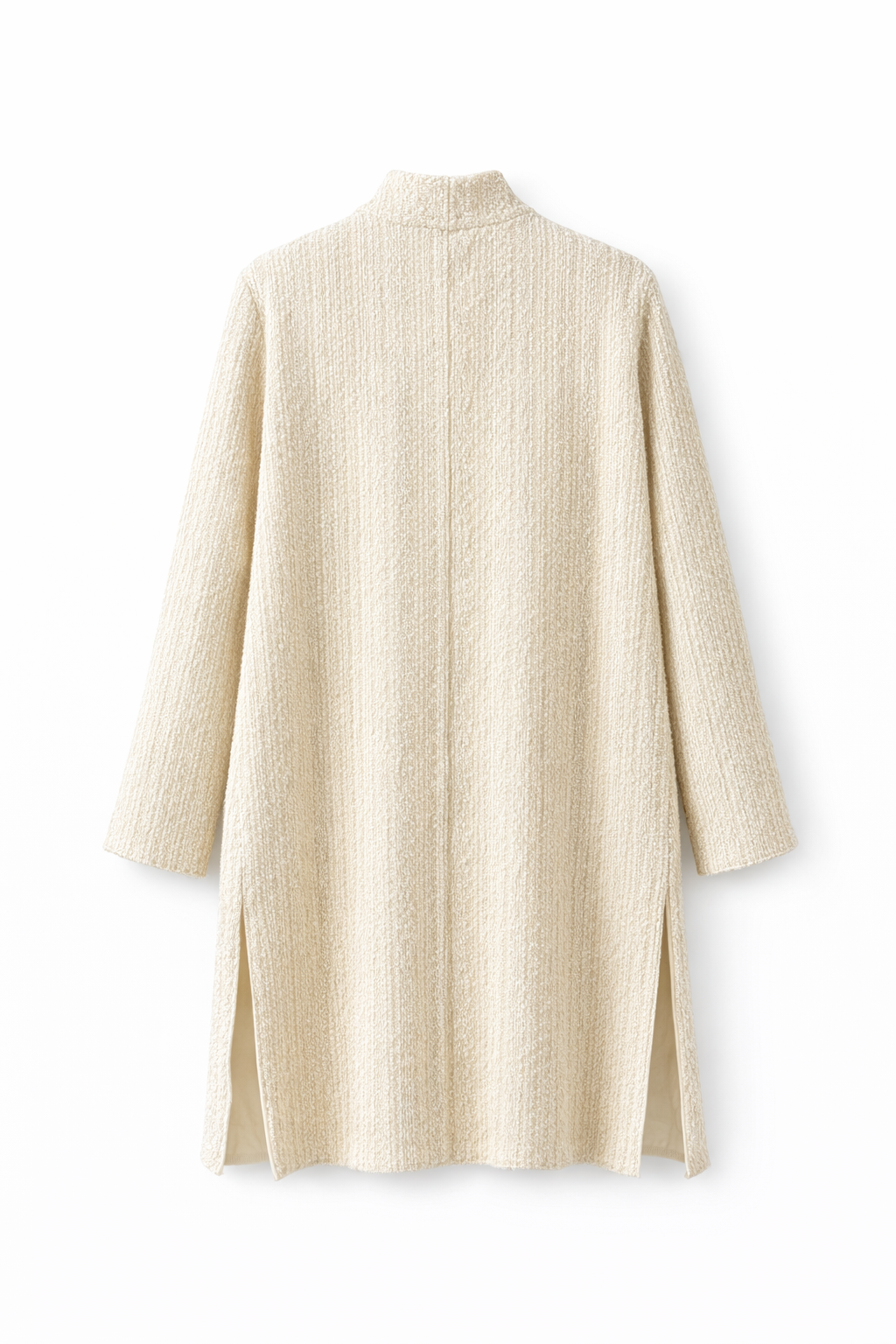 Giacca Begonia lunga, pensata come capo versatile da indossare sia come giacca sia come spolverino. Il filo di lurex dona una luminosità naturale e raffinata, per un’eleganza discreta e senza tempo.