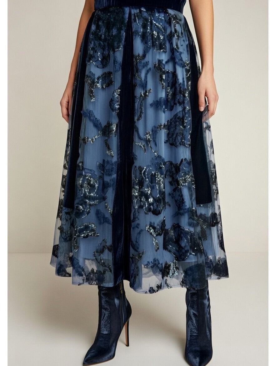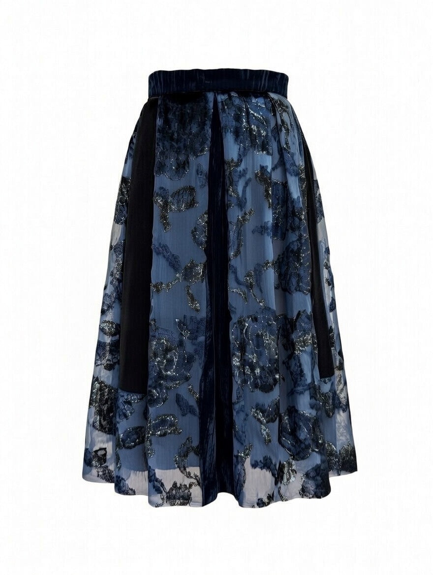 Gonna a pieghe in velluto devoré, preziosa e fluida, capace di creare movimento e profondità. Un capo unico realizzato per la sfilata Erendira, espressione di ricerca sartoriale.
