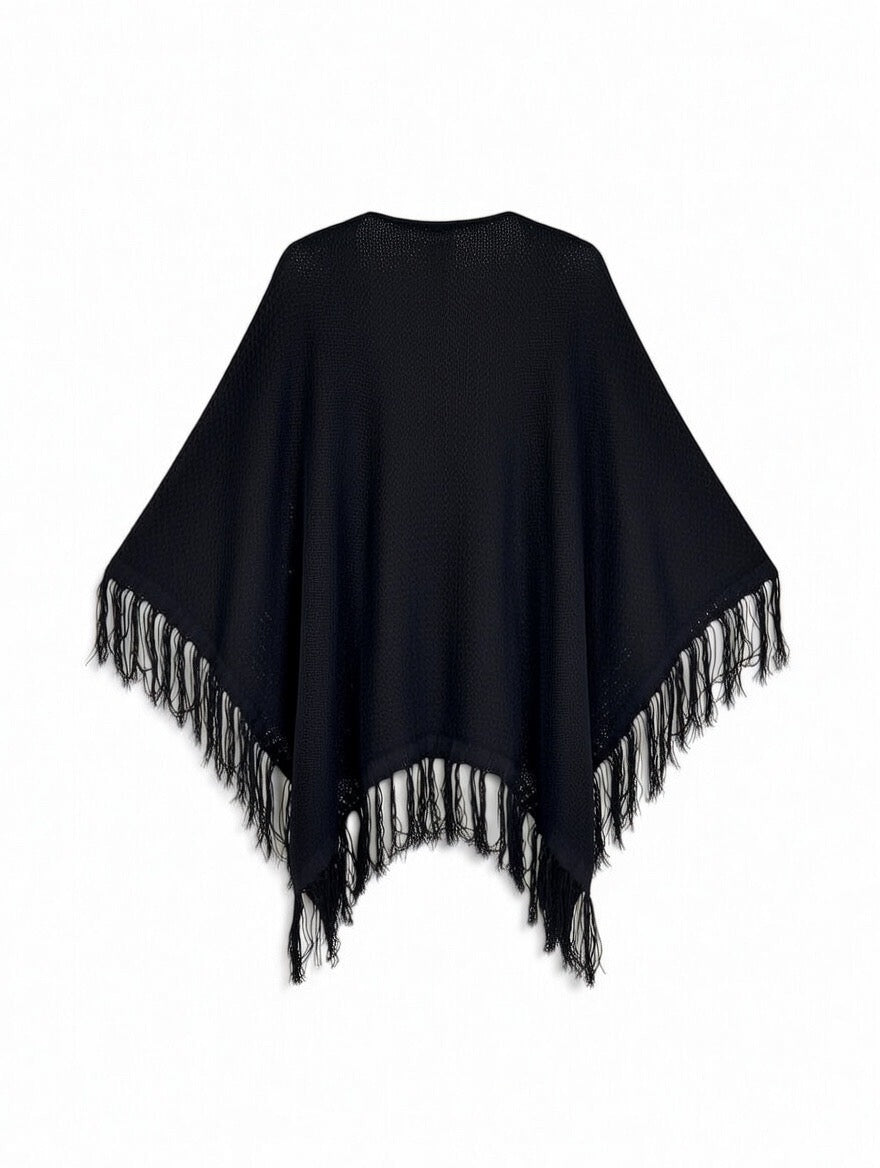 Mantella con frange in lana dal forte impatto visivo. Un capo iconico e avvolgente, realizzato per la sfilata Erendira, che unisce movimento e carattere.