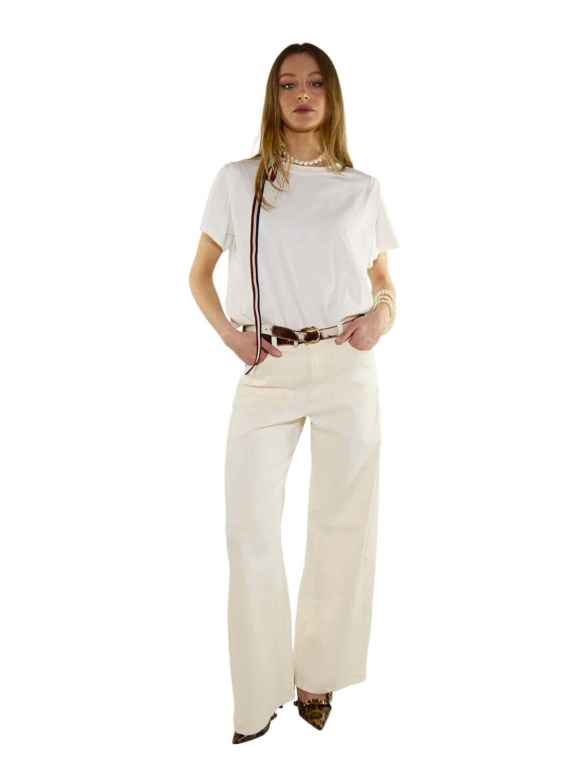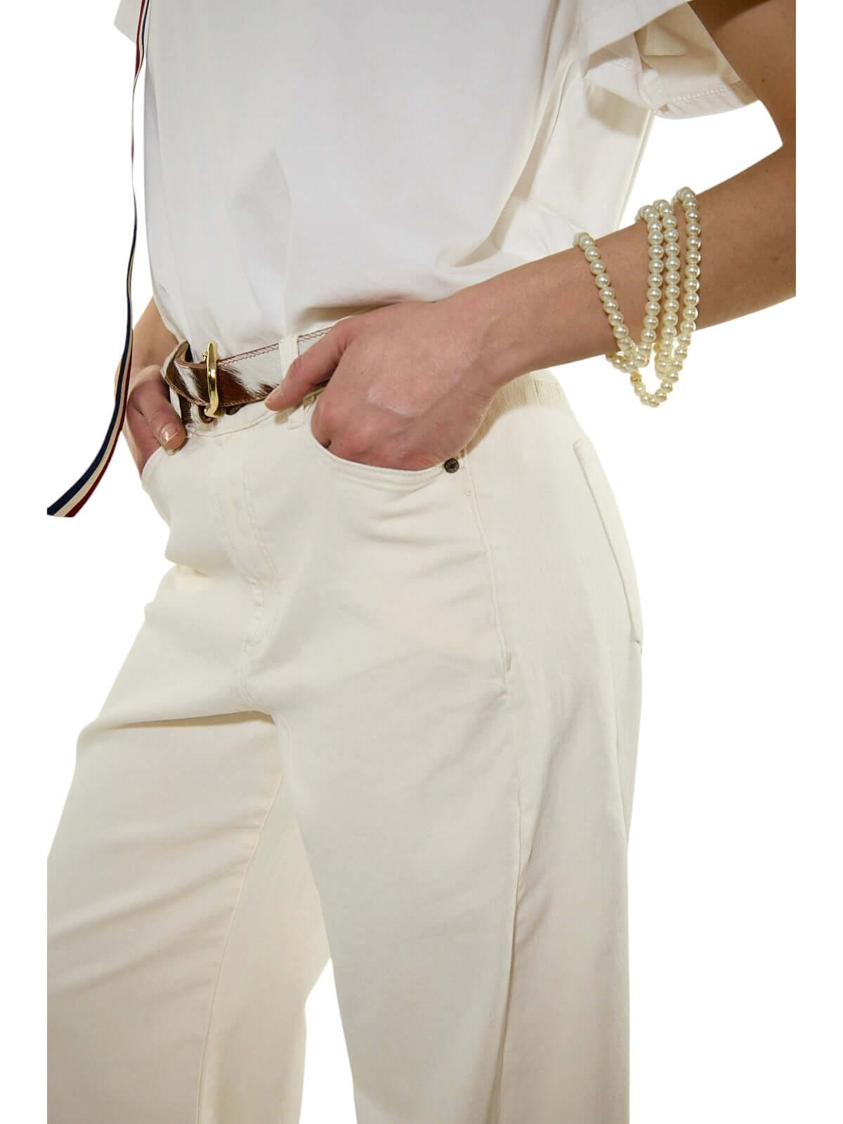 Pantalone denim stretch colorato. Dedicato al ritorno in città, questo pantalone in denim stretch colorato ultra morbido unisce comfort e stile. La gamba ampia, la nuance marrone intenso (uno dei colori simbolo di stagione) e la silhouette pulita lo rendono un vero pass-partout autunnale. Perfetto con uno stivaletto o una sneaker, è il pantalone ideale da mattina a sera.