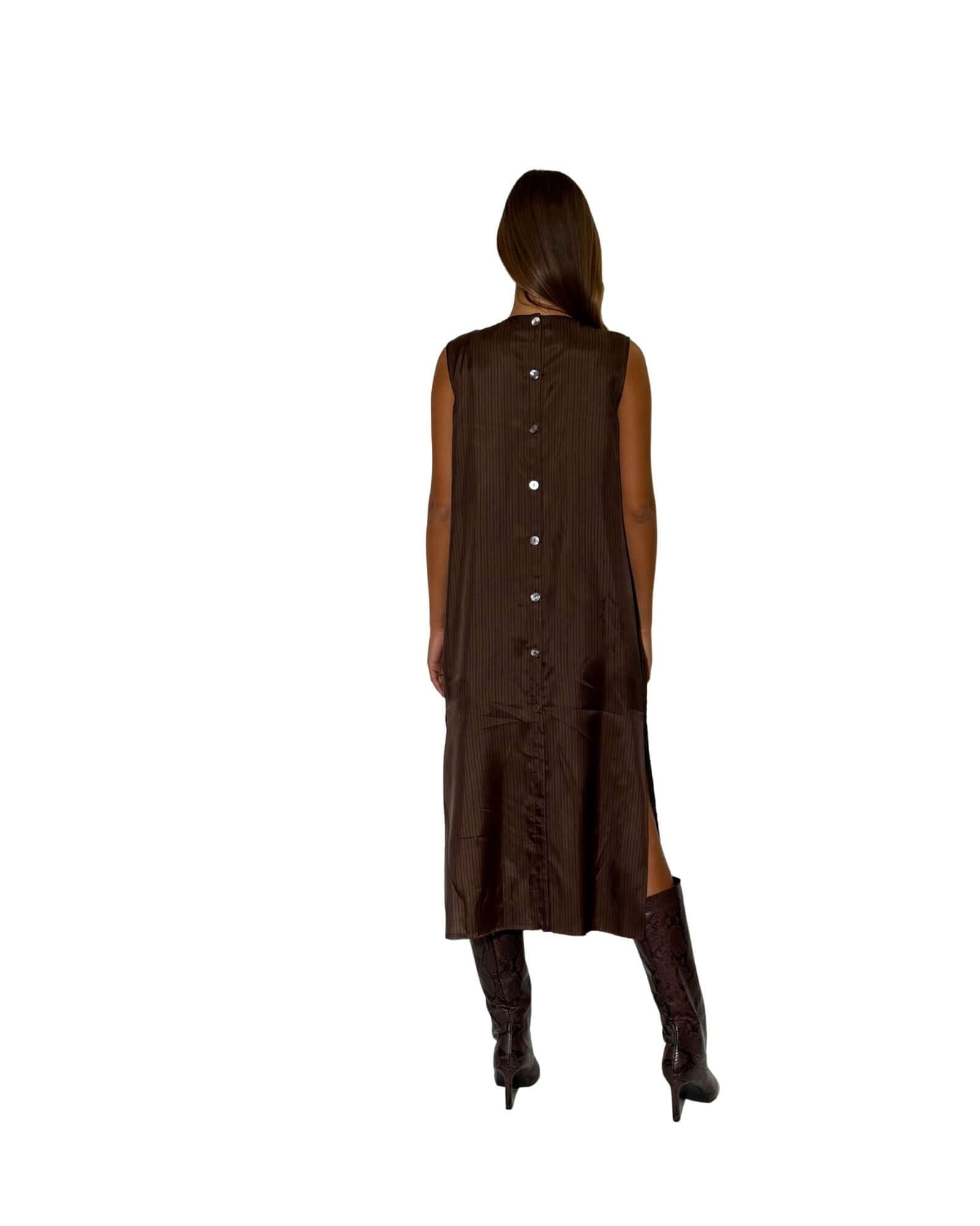 L’Abito Citrino ha una linea tunica smanicato con spacchi laterali che donano leggerezza e movimento, mentre la chiusura posteriore con bottoni a tutta lunghezza aggiunge un dettaglio prezioso e inaspettato.