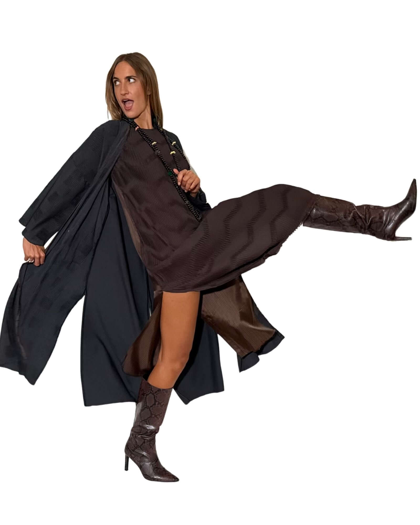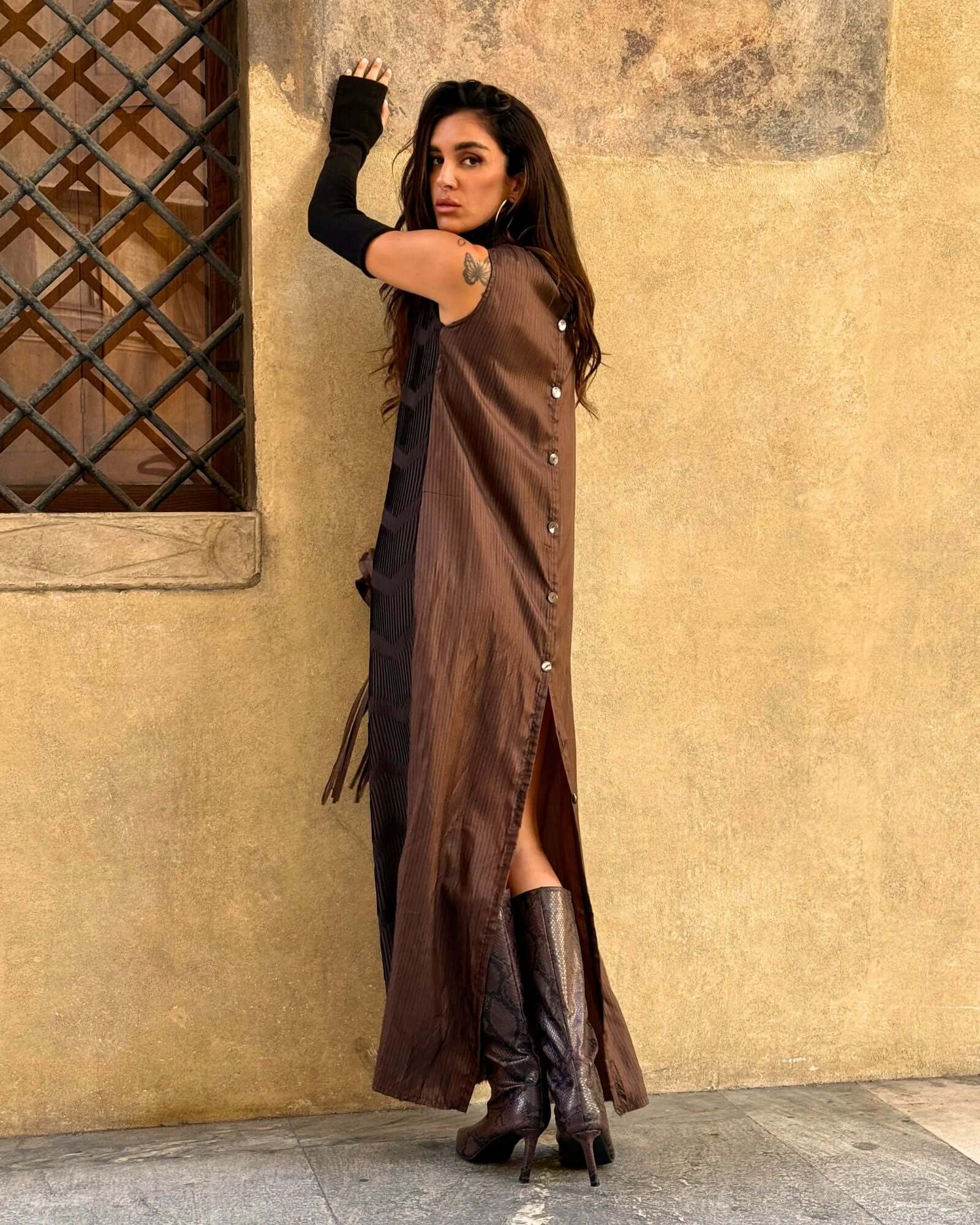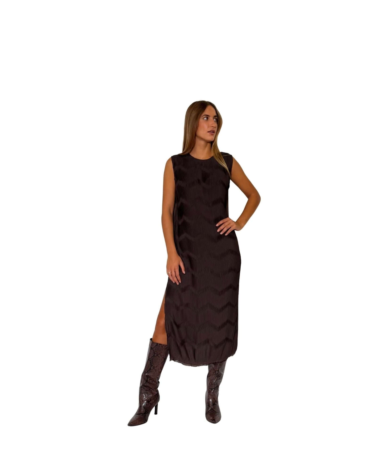 Il fronte è valorizzato da un plissé geometrico che percorre l’intera lunghezza, trasformandolo in un capo scultoreo e sofisticato; il retro, con righe nere e mocha sottili, rivela un contrasto elegante e contemporaneo.