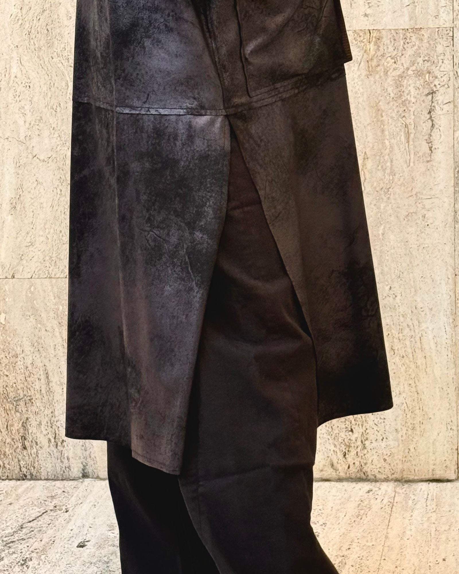 Giacca kimono lunga in morbido eco suede color nero, una rivisitazione sofisticata e contemporanea di uno dei capi iconici Erendira.