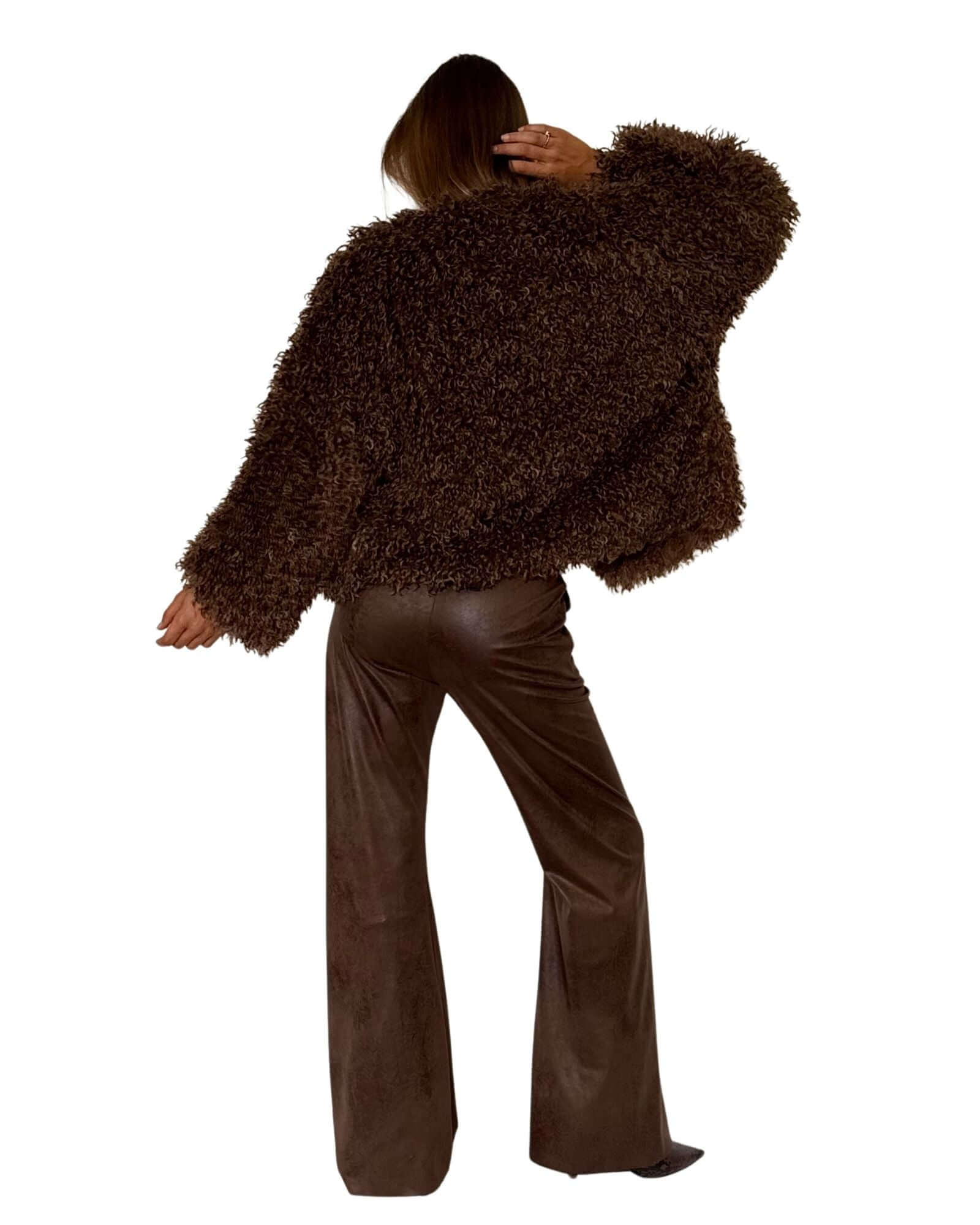 La Giacchina Bruciato è un concentrato di morbidezza e stile. Realizzata in eco mongolia soffice e avvolgente, si distingue per la manica ampia e la chiusura frontale che la rendono pratica e versatile.