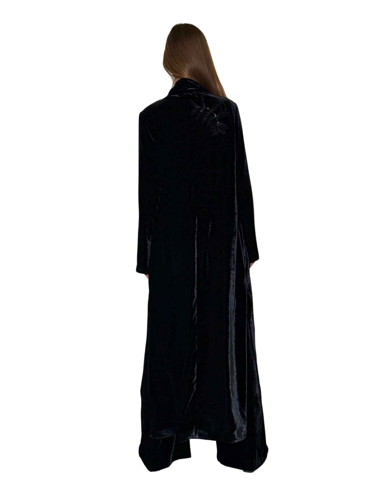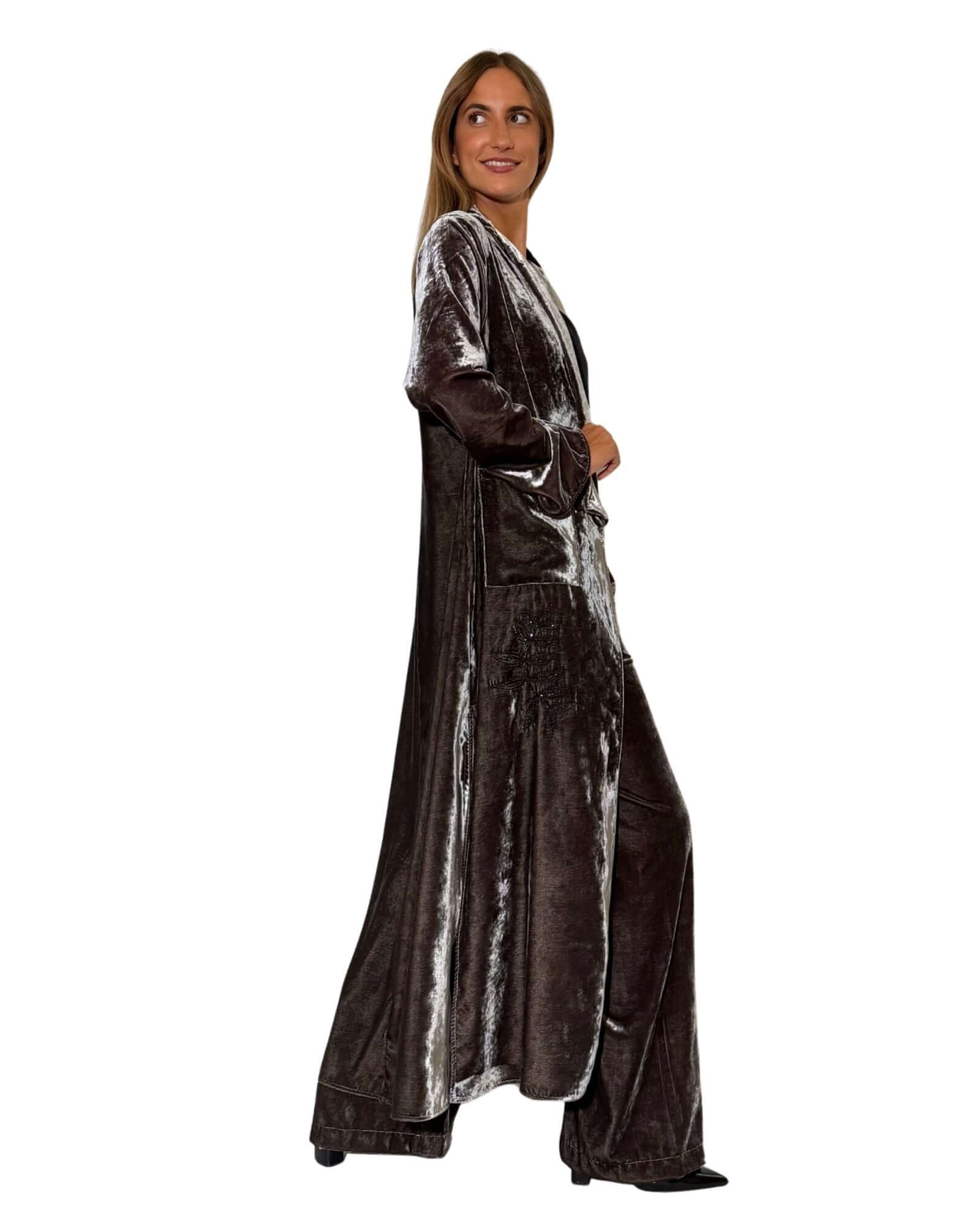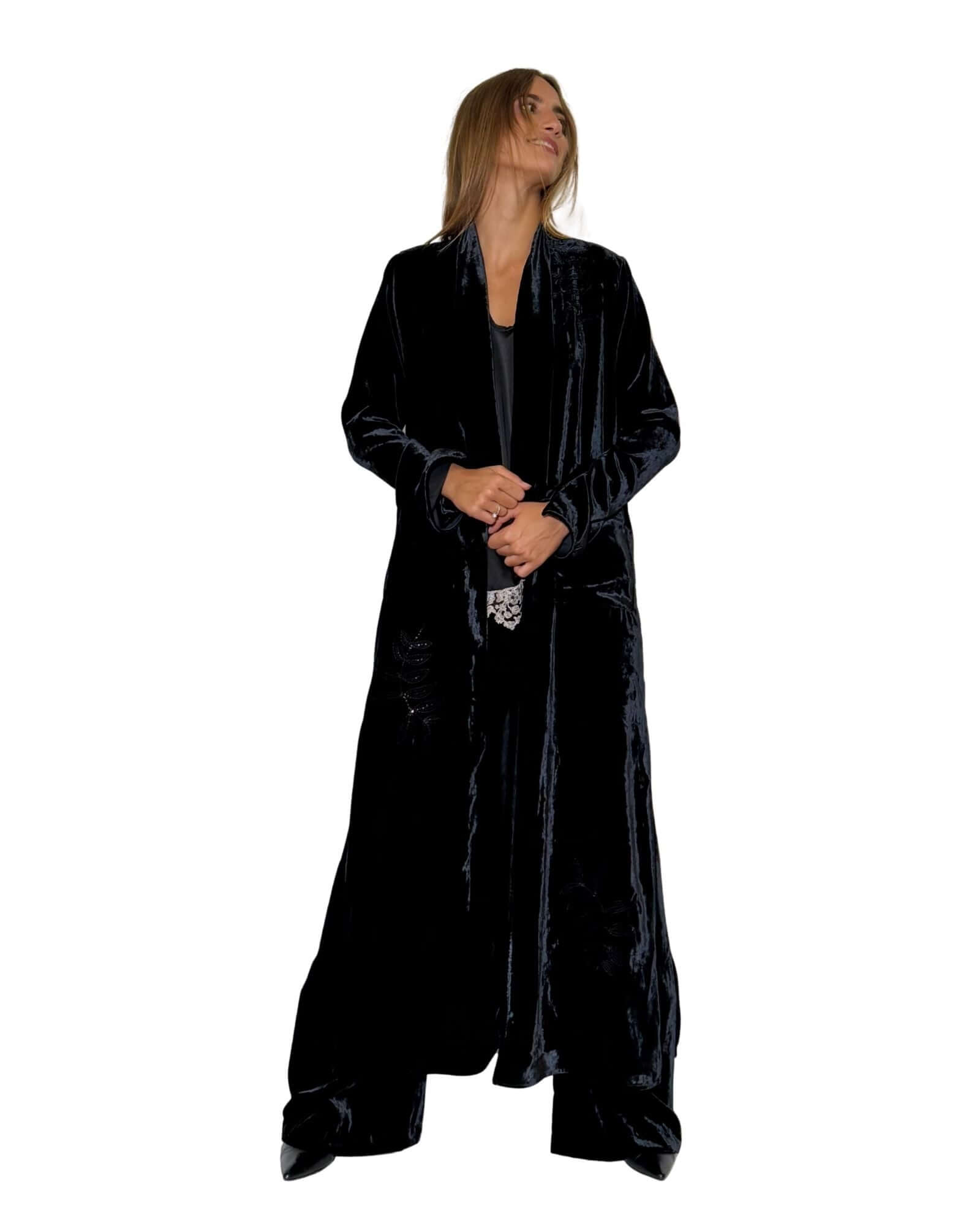 Lungo e fluido, con collo smoking e spacchi laterali, slancia la figura con naturalezza. I ricami gioiello in filo e micro paillettes aggiungono luminosità e raffinatezza, trasformandolo in un vero statement di stile.
