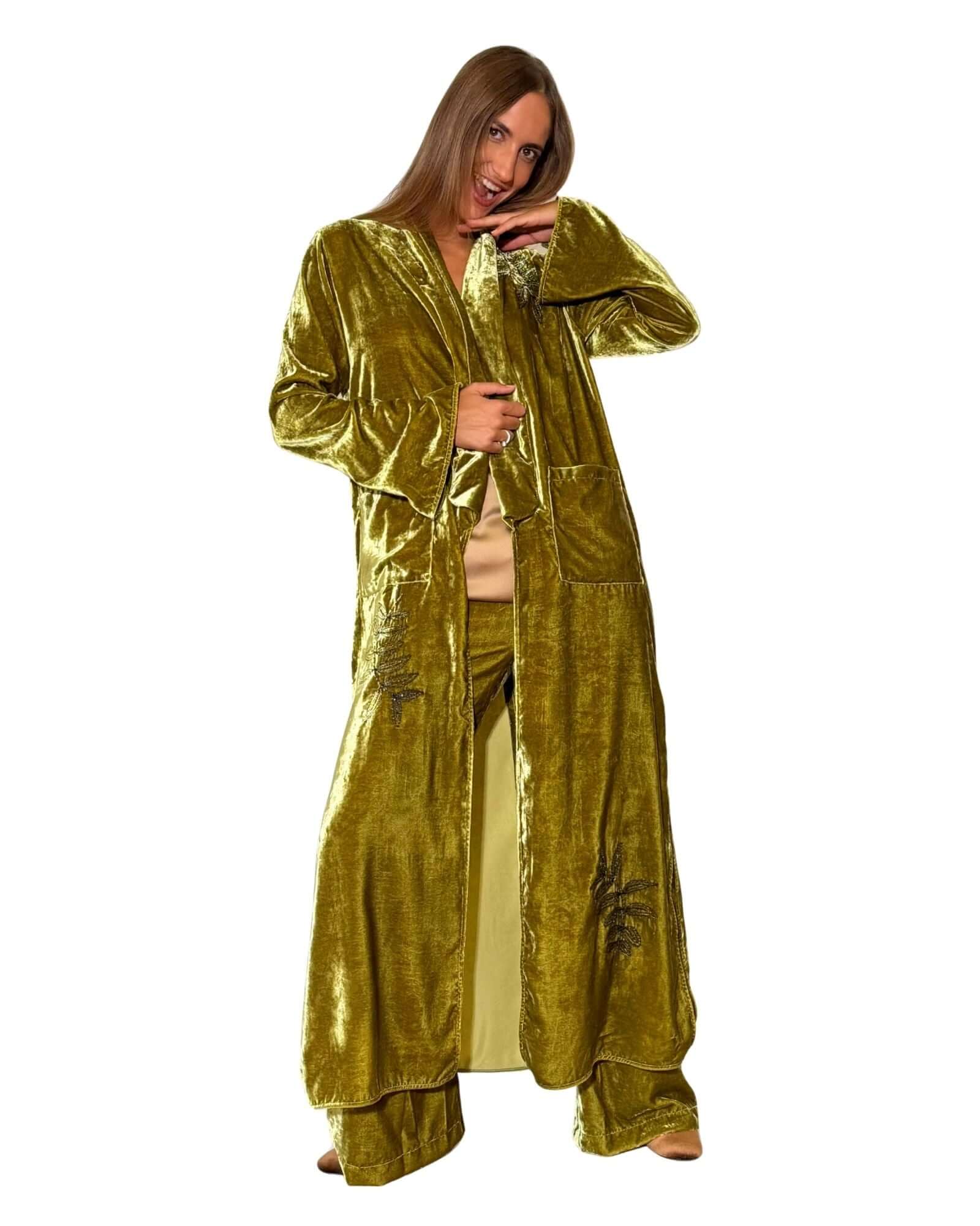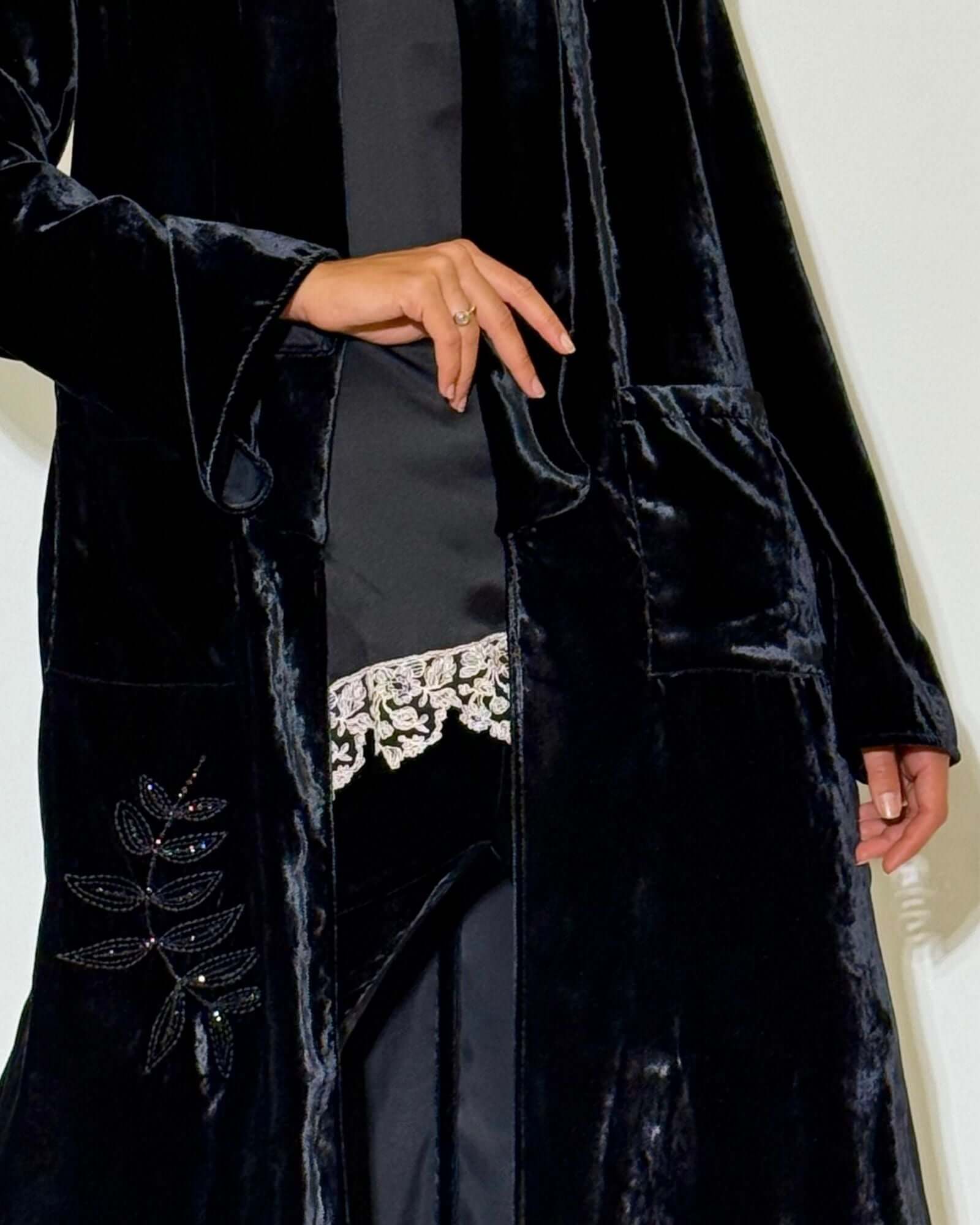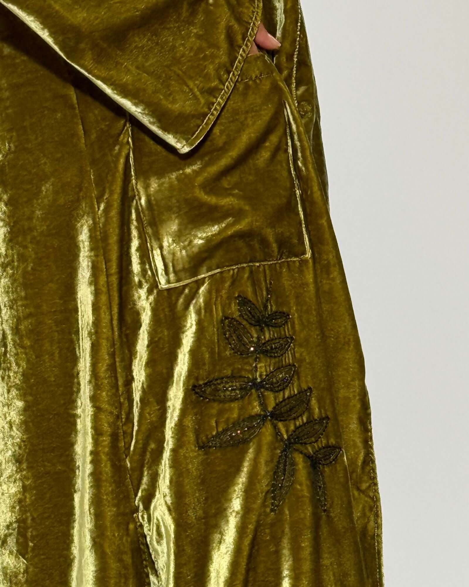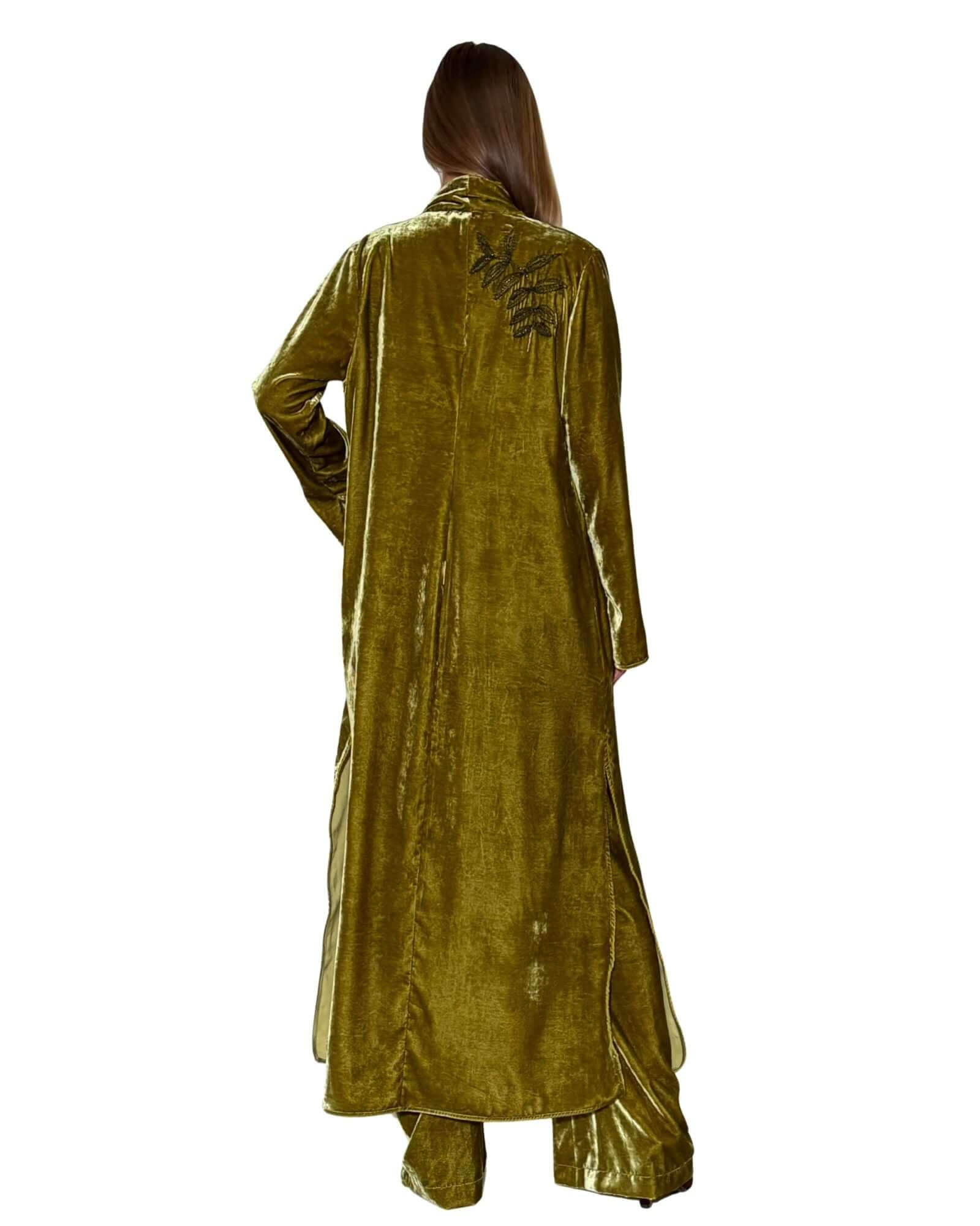 Lungo e fluido, con collo smoking e spacchi laterali, slancia la figura con naturalezza. I ricami gioiello in filo e micro paillettes aggiungono luminosità e raffinatezza, trasformandolo in un vero statement di stile.