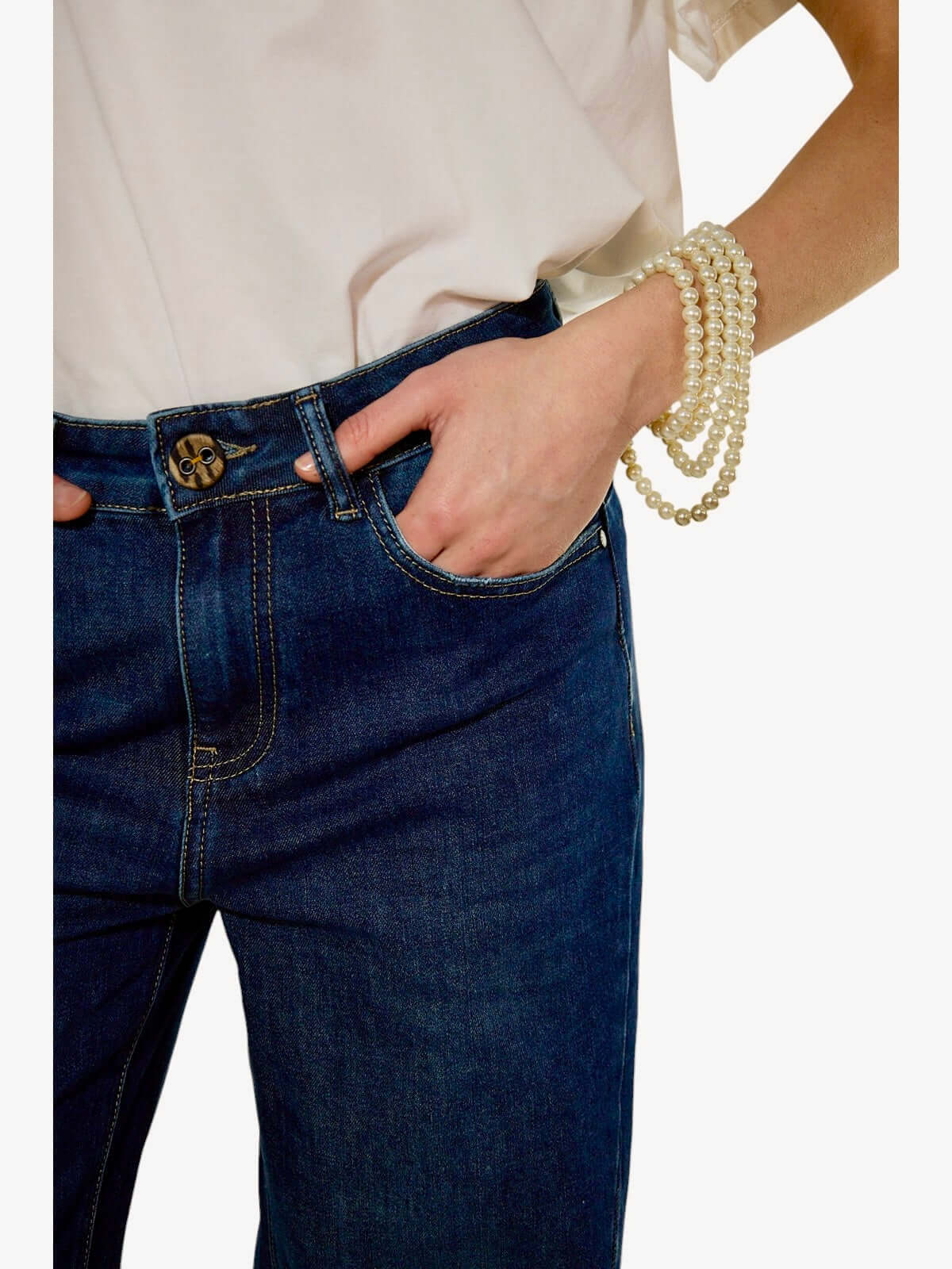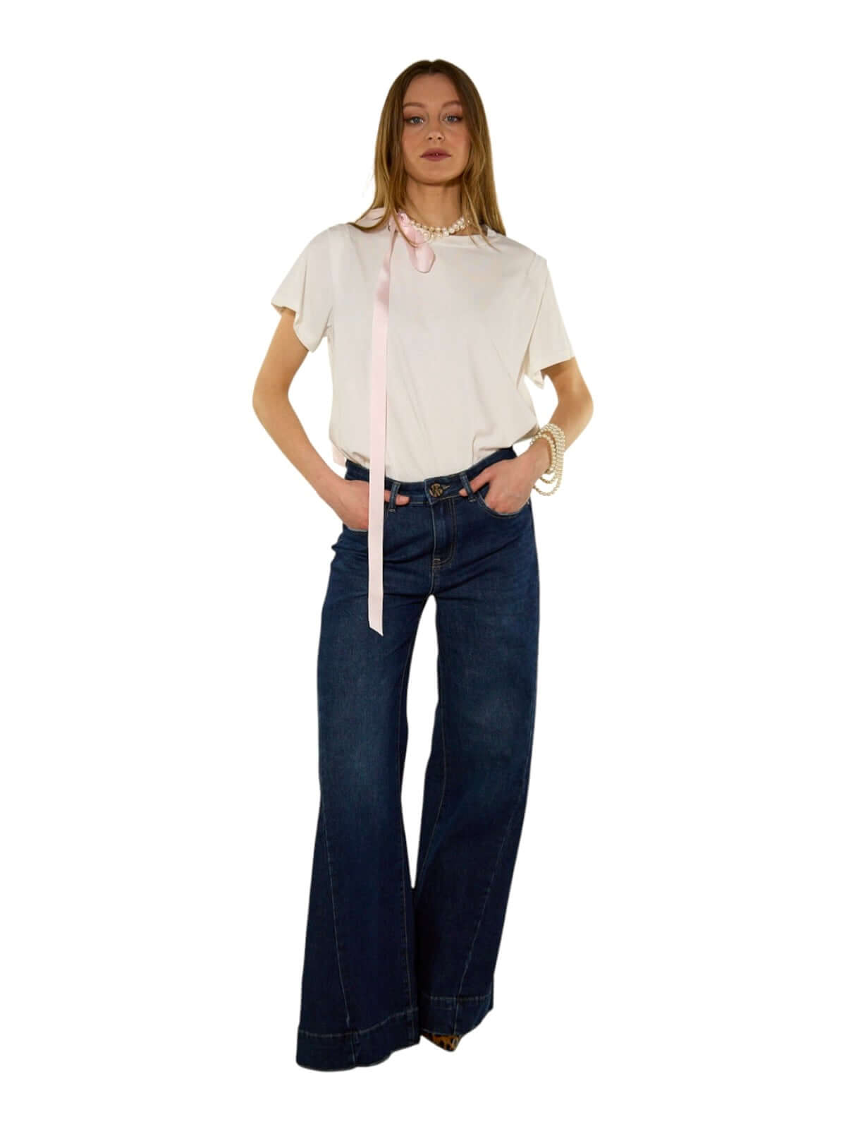 Colored stretch denim pants. Dedicated to the return to the city, these ultra-soft colored stretch denim pants combine comfort and style. The wide leg, the intense brown shade (one of the season's signature colors), and the clean silhouette make them a true autumn wardrobe staple. Perfect with ankle boots or sneakers, they are the ideal pants from morning to evening.