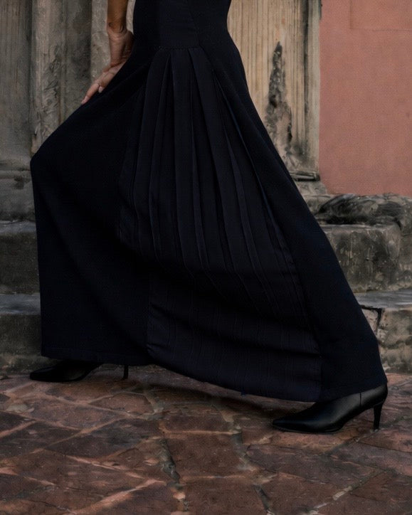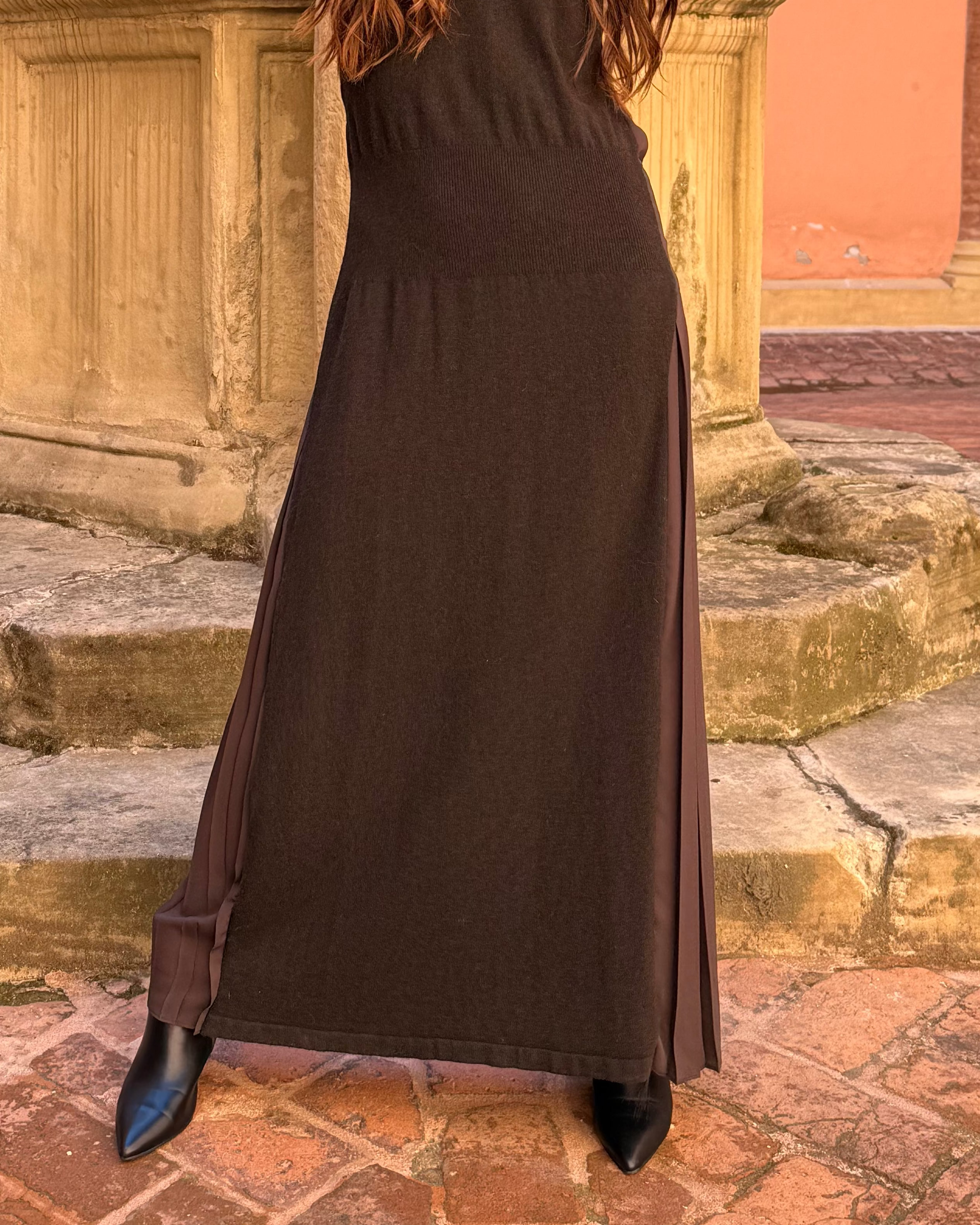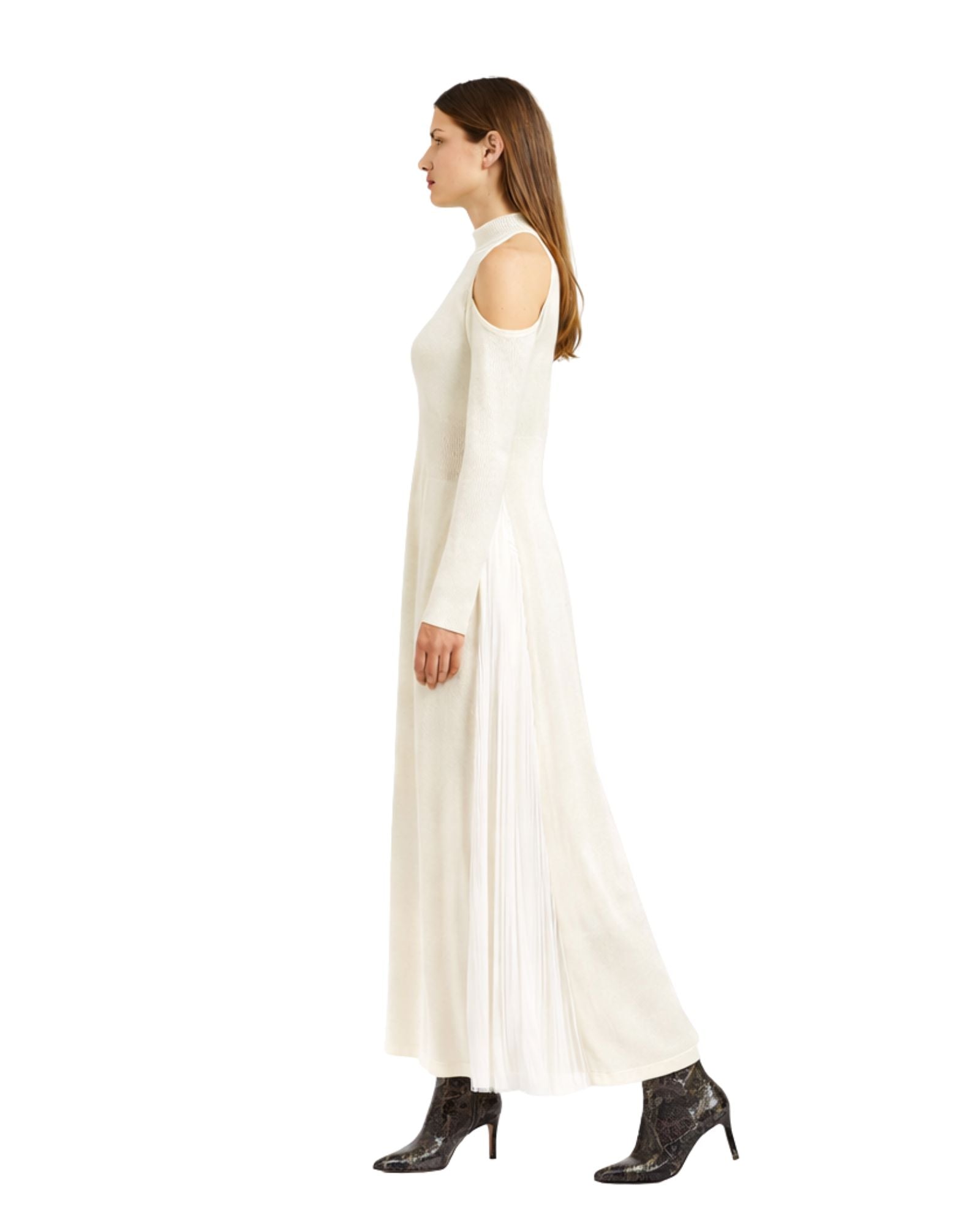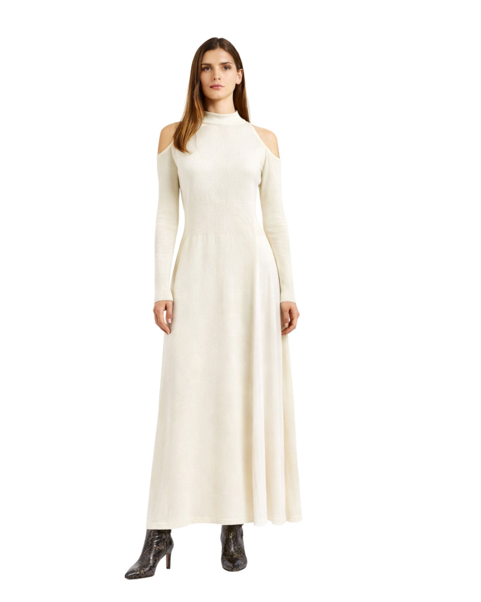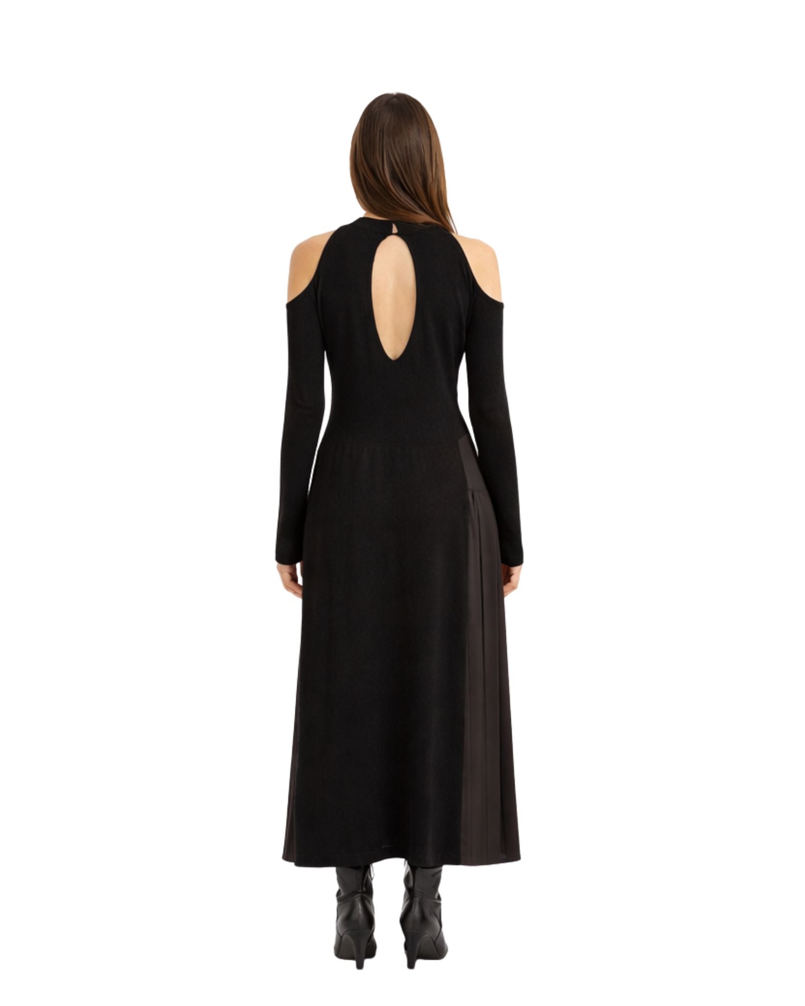 Garment dedicated to those who love to amaze with details, tight-fitting that enhances the figure. Long dress with side slit, ribbed waist and glove sleeves. Particular back with teardrop opening and uncovered shoulders.