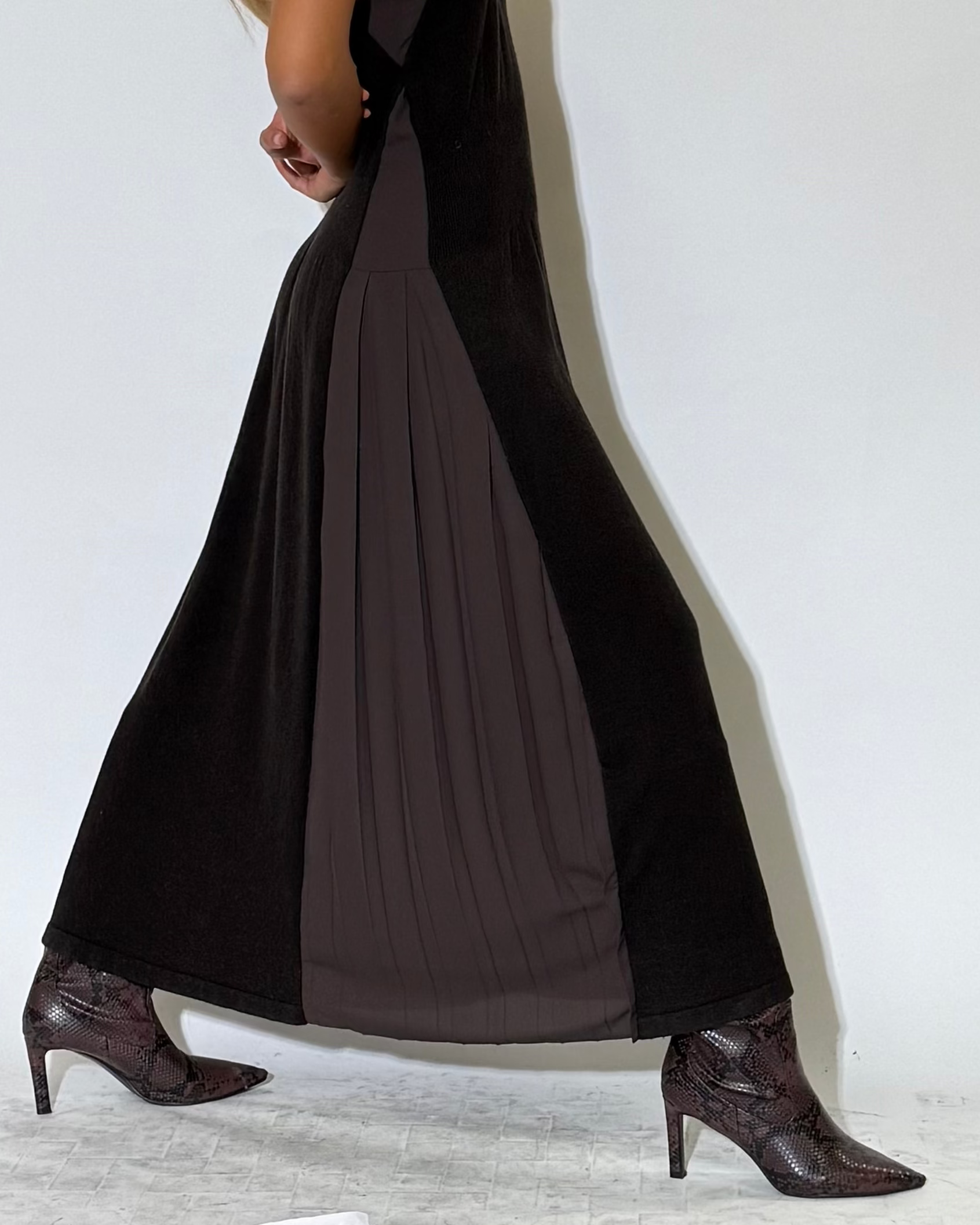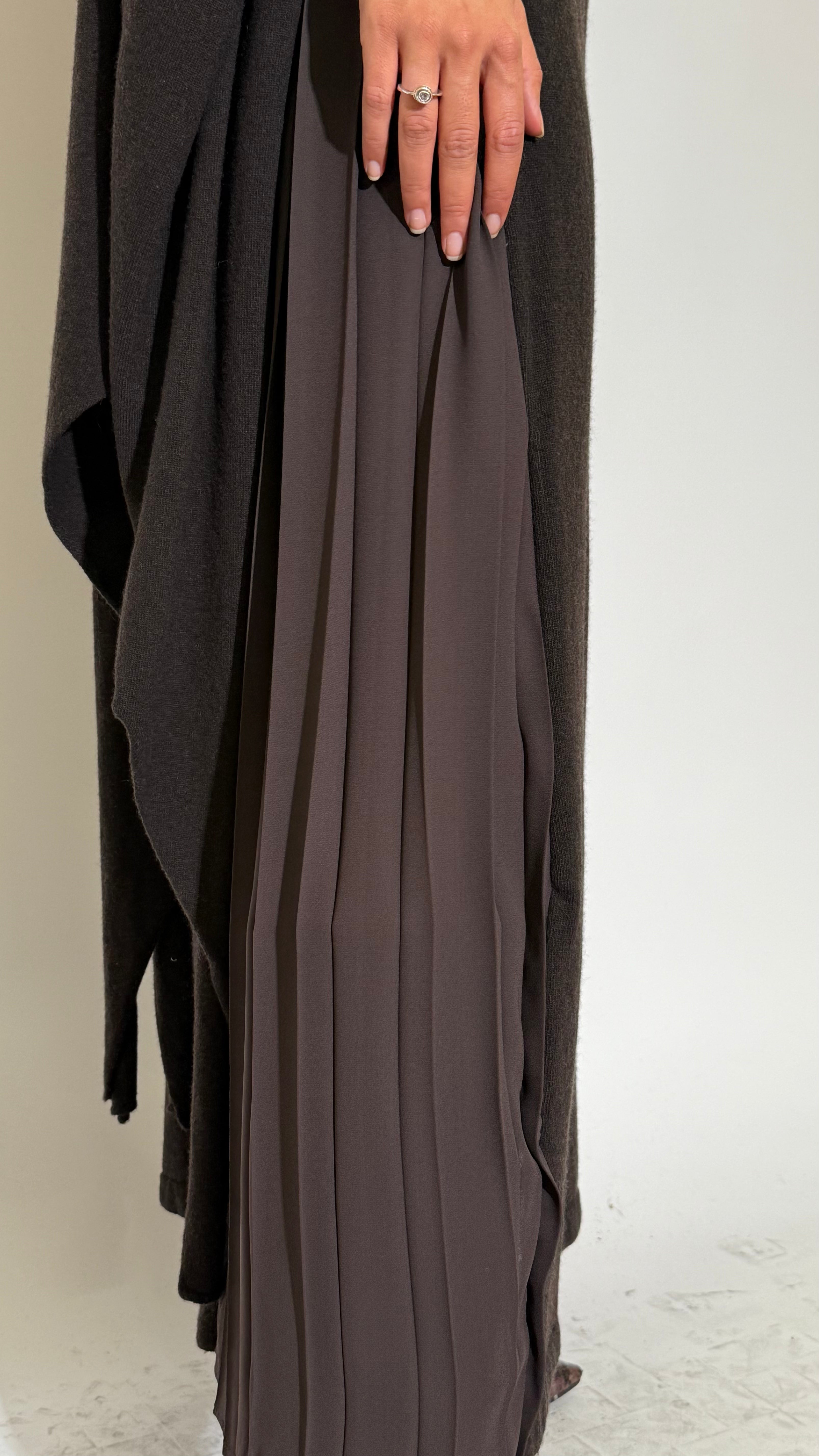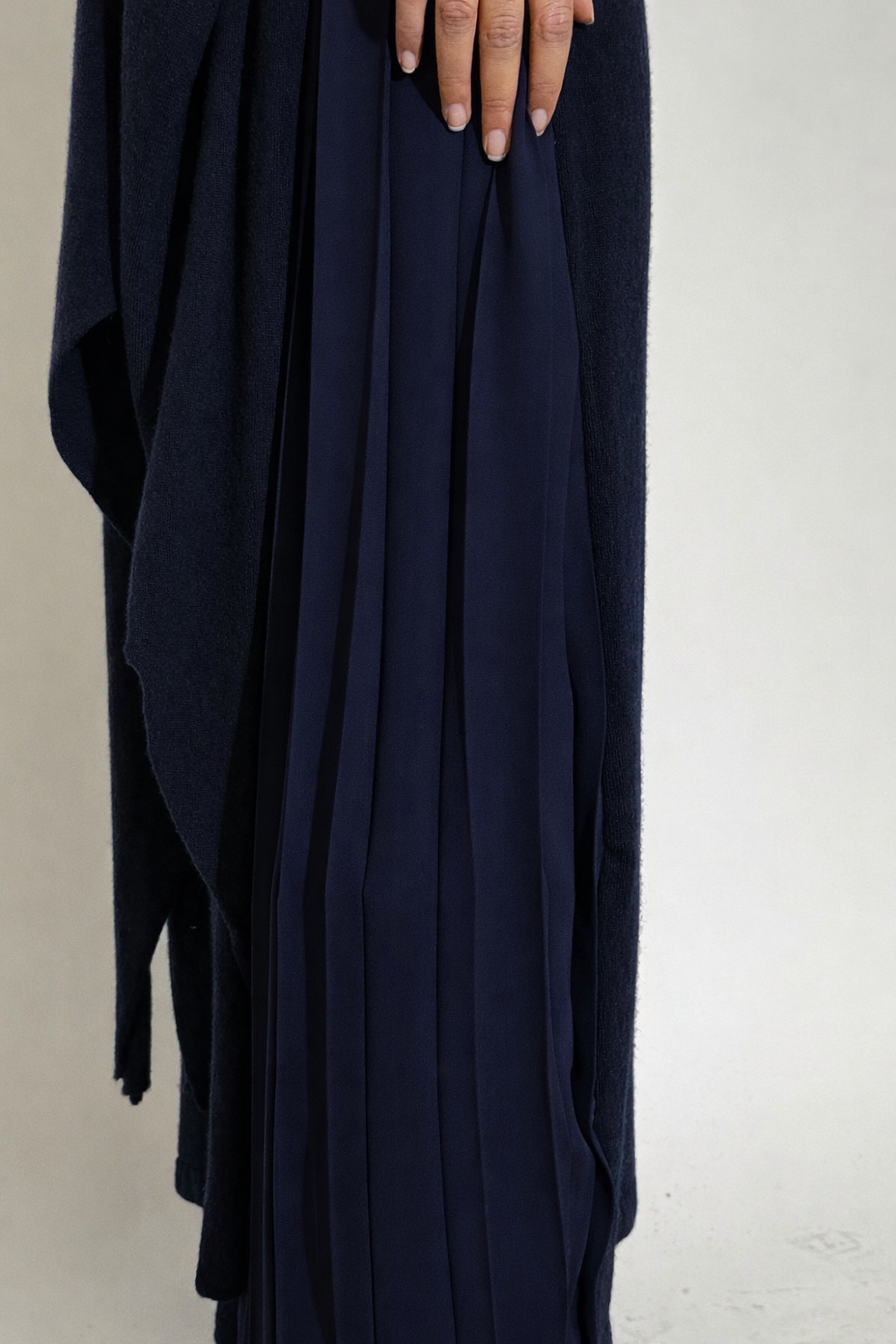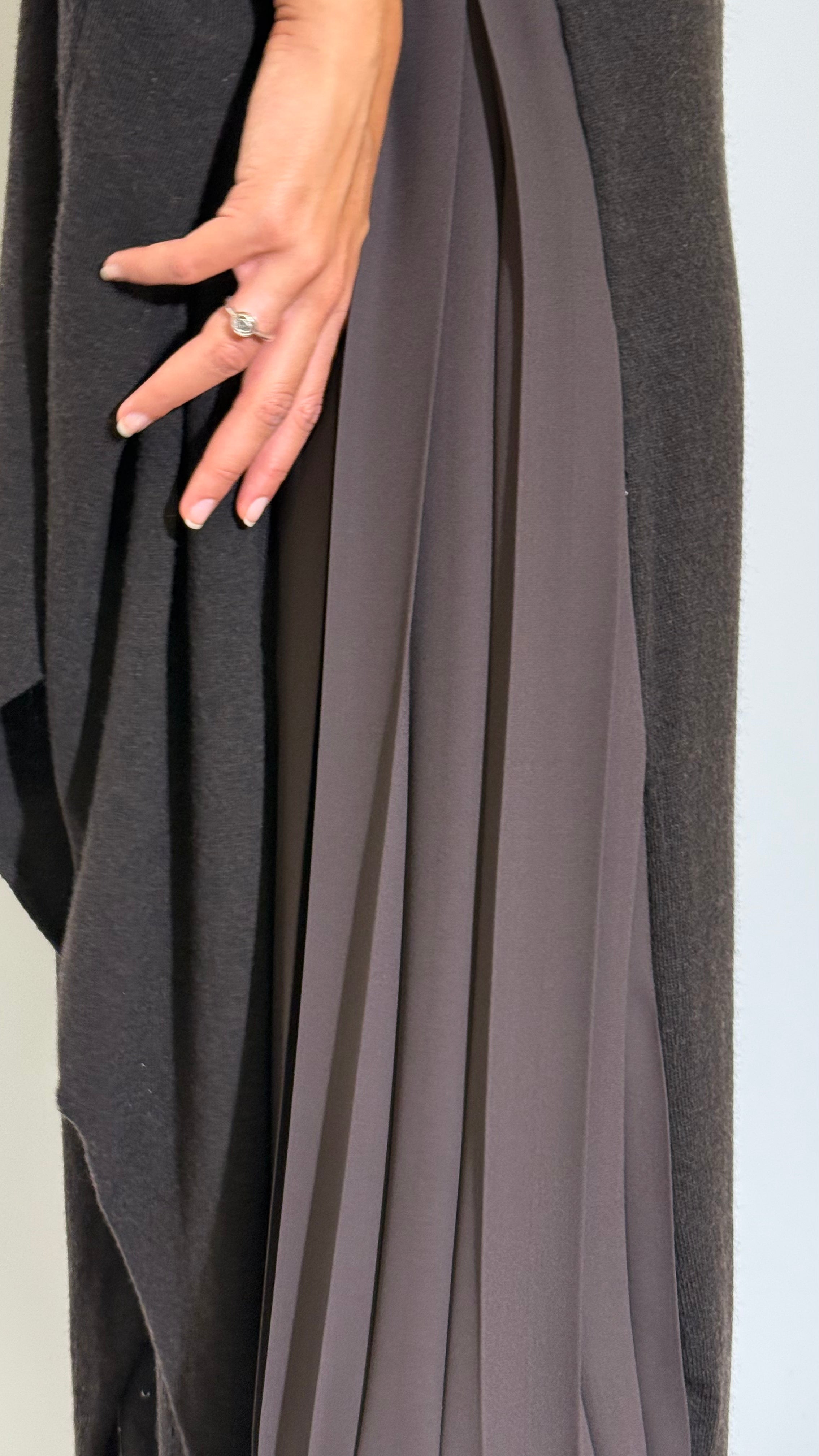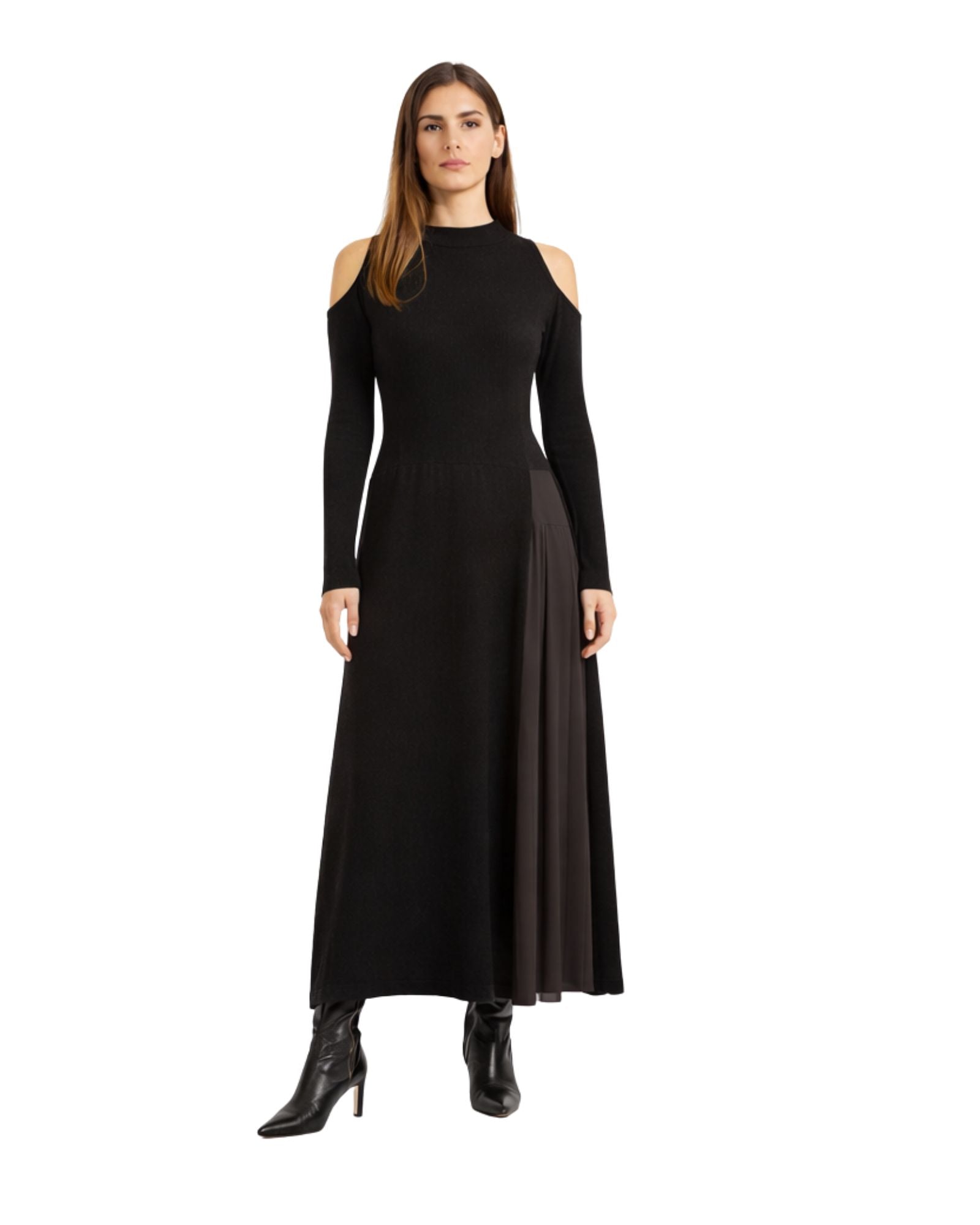 Garment dedicated to those who love to amaze with details, tight-fitting that enhances the figure. Long dress with side slit, ribbed waist and glove sleeves. Particular back with teardrop opening and uncovered shoulders.