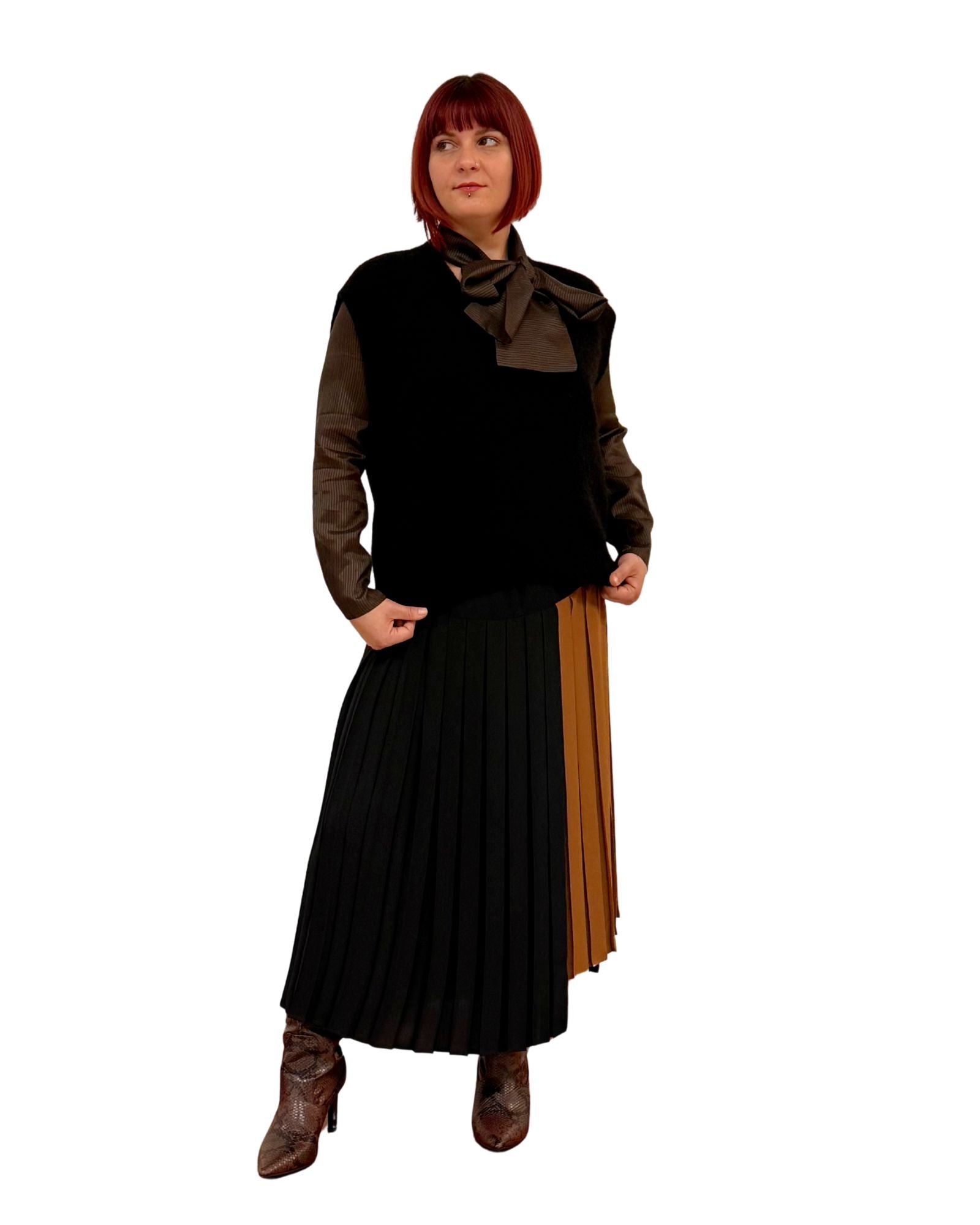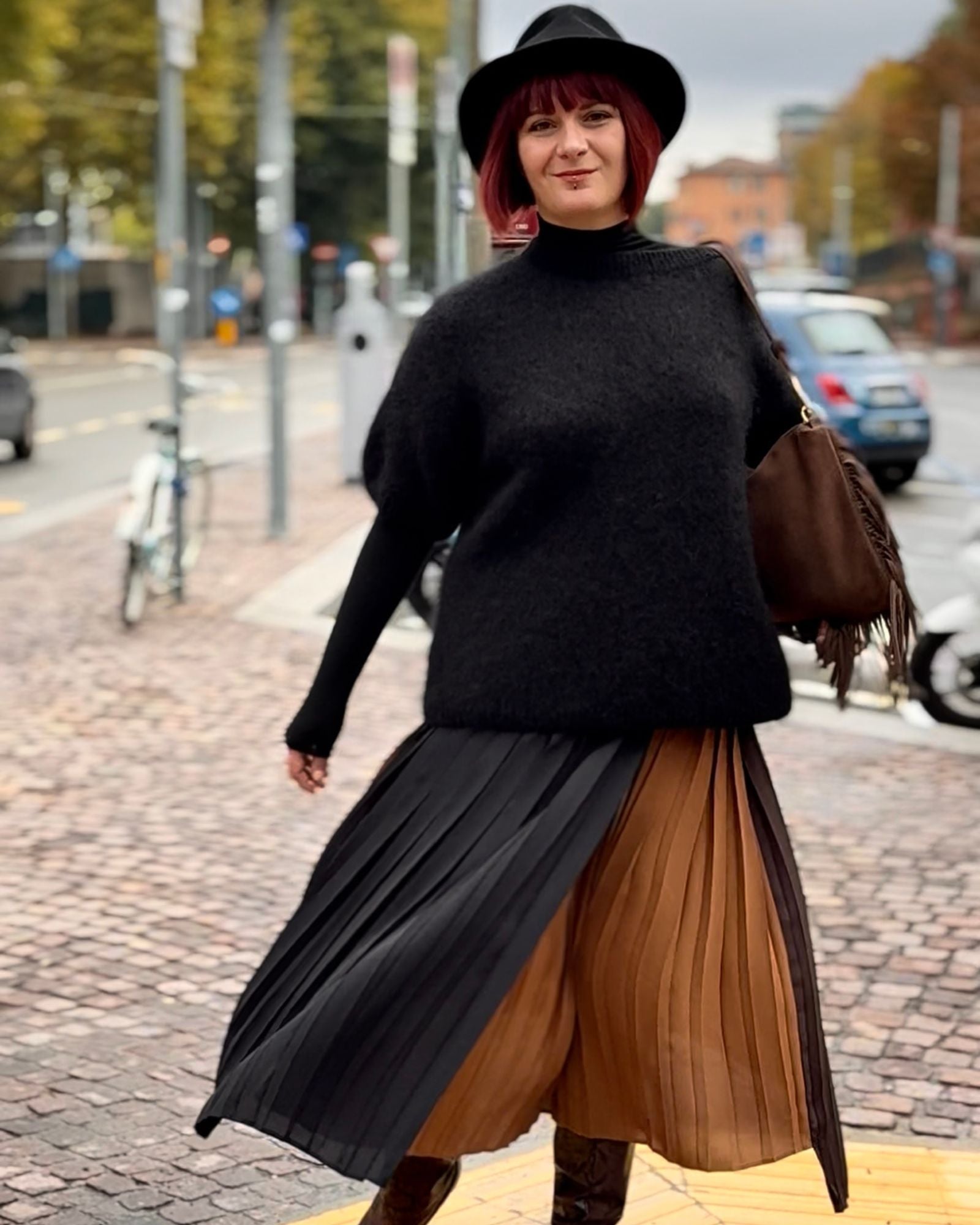 The black striped mocha shade enhances its sophisticated charm, transforming it into a garment that combines elegance, trendiness, and freedom of movement.