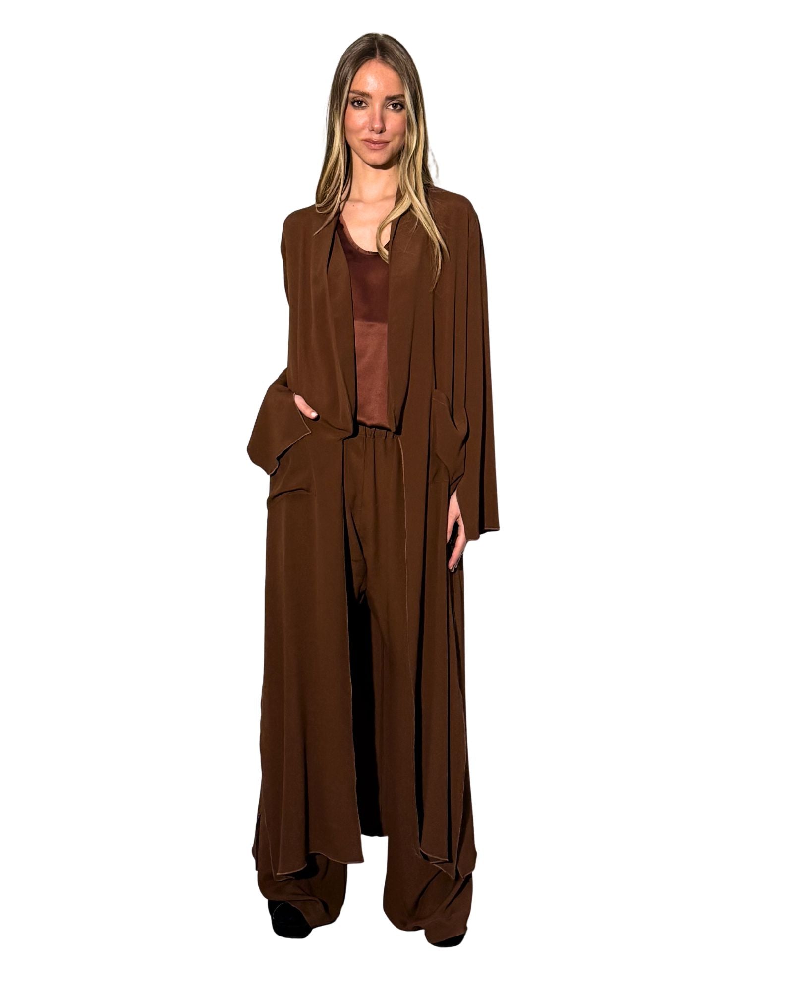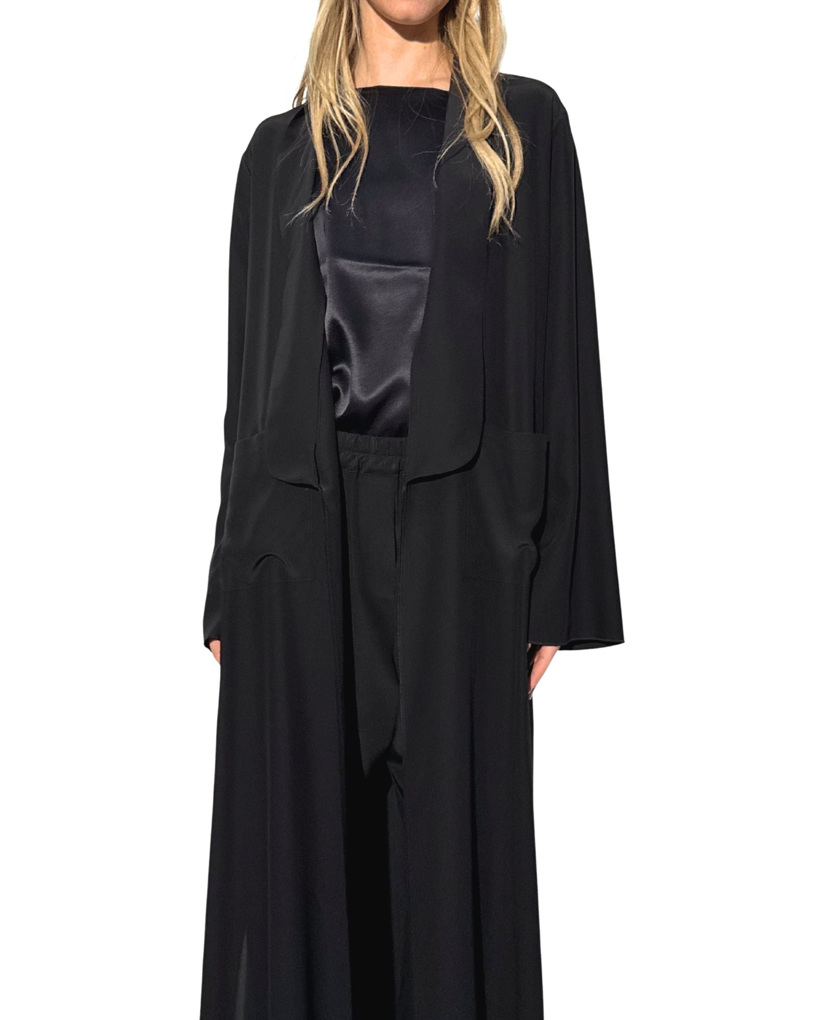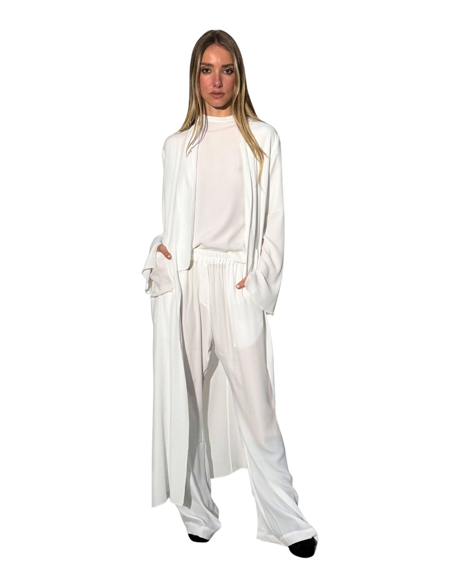 Versatile e raffinato, può essere indossato come spolverino primaverile, come giacca elegante o come parte di un completo coordinato con il suo pantalone in crepe de chine tono su tono.