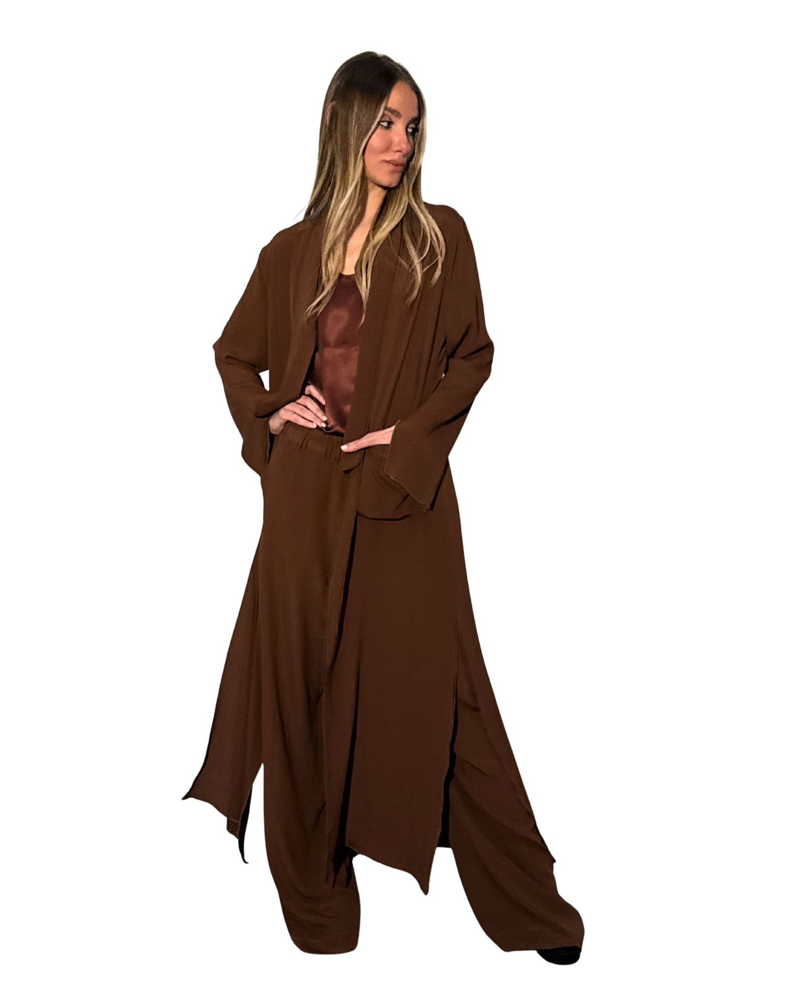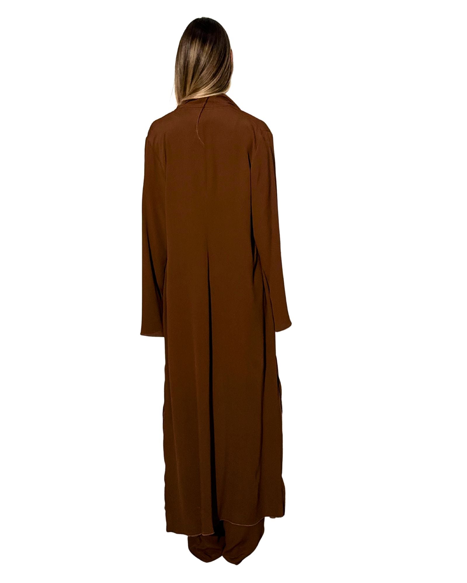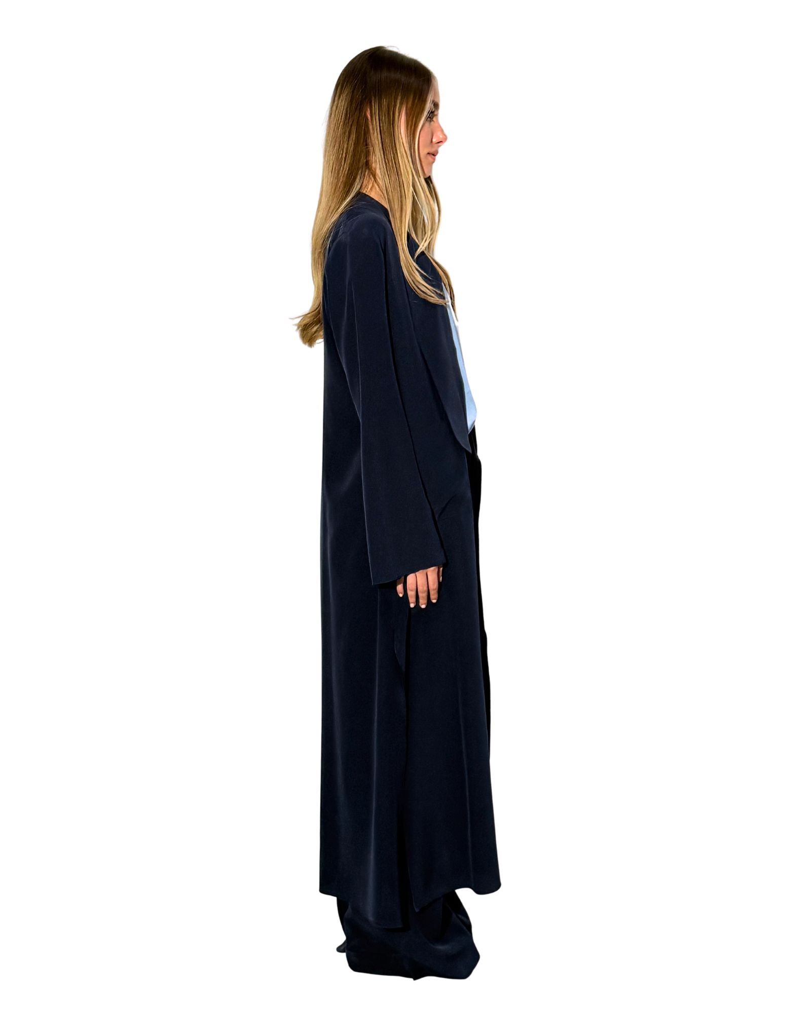 Versatile e raffinato, può essere indossato come spolverino primaverile, come giacca elegante o come parte di un completo coordinato con il suo pantalone in crepe de chine tono su tono.